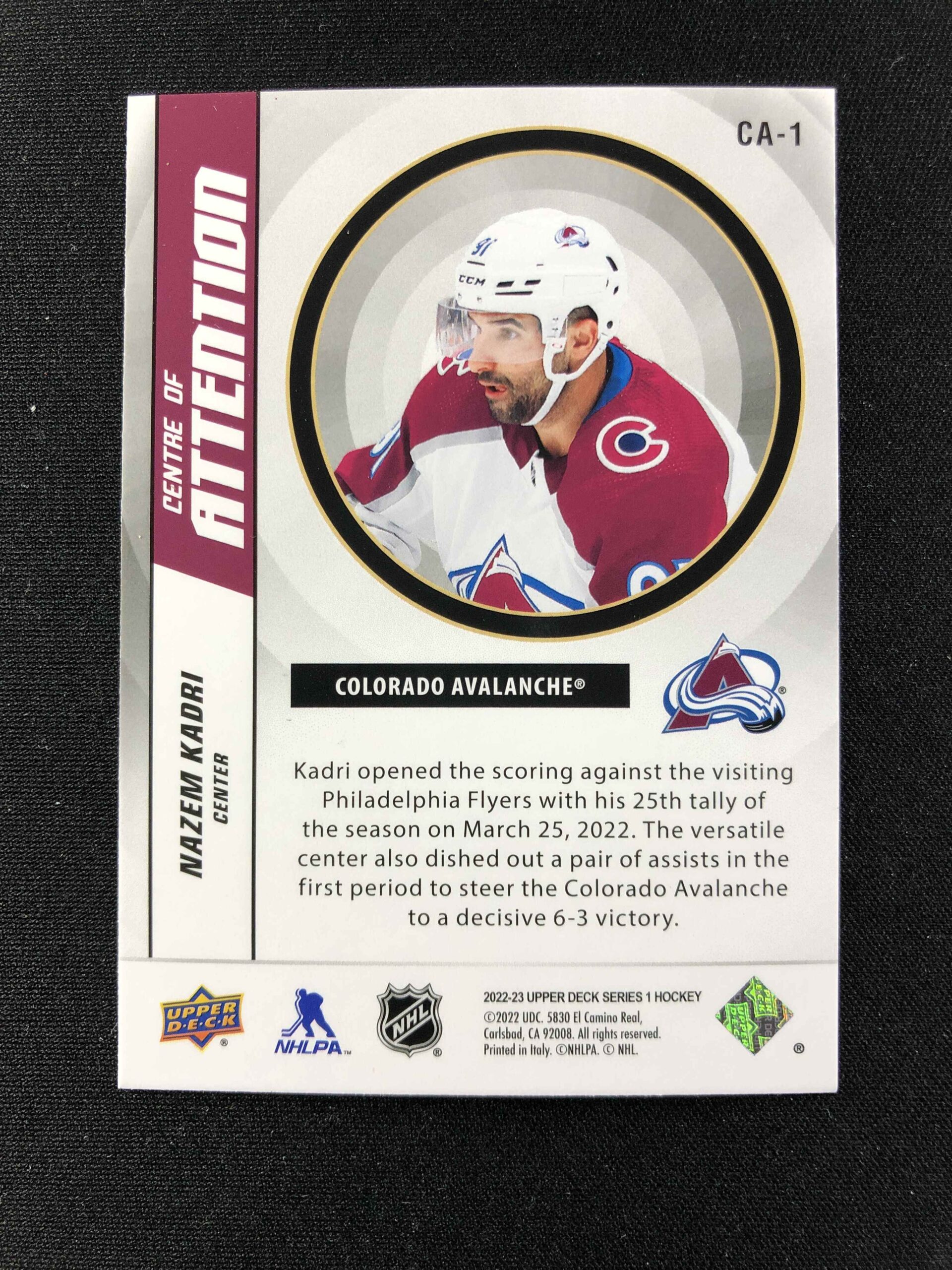 Sběratelská karta 2022/2023 Upper Deck Series 1 Centre of Attention CA-1 Nazem Kadri Inzert