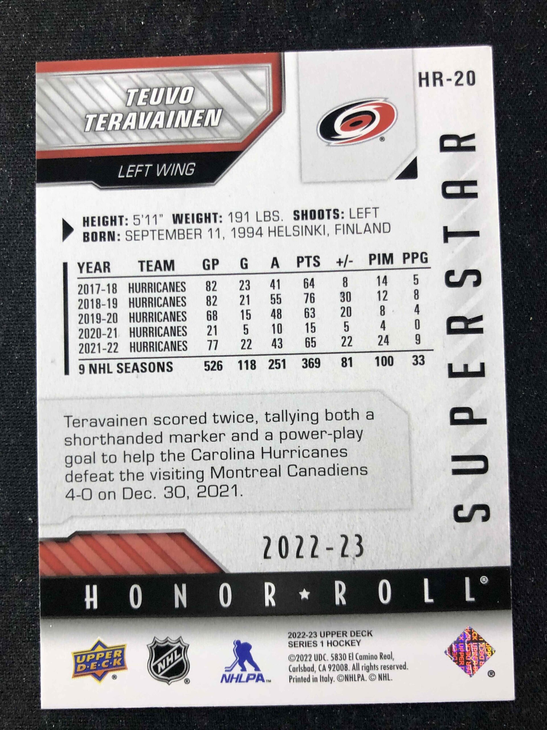 Sběratelská karta 2022/2023 Upper Deck Series 1 Honor Roll HR-20 Teuvo Teravainen Inzert