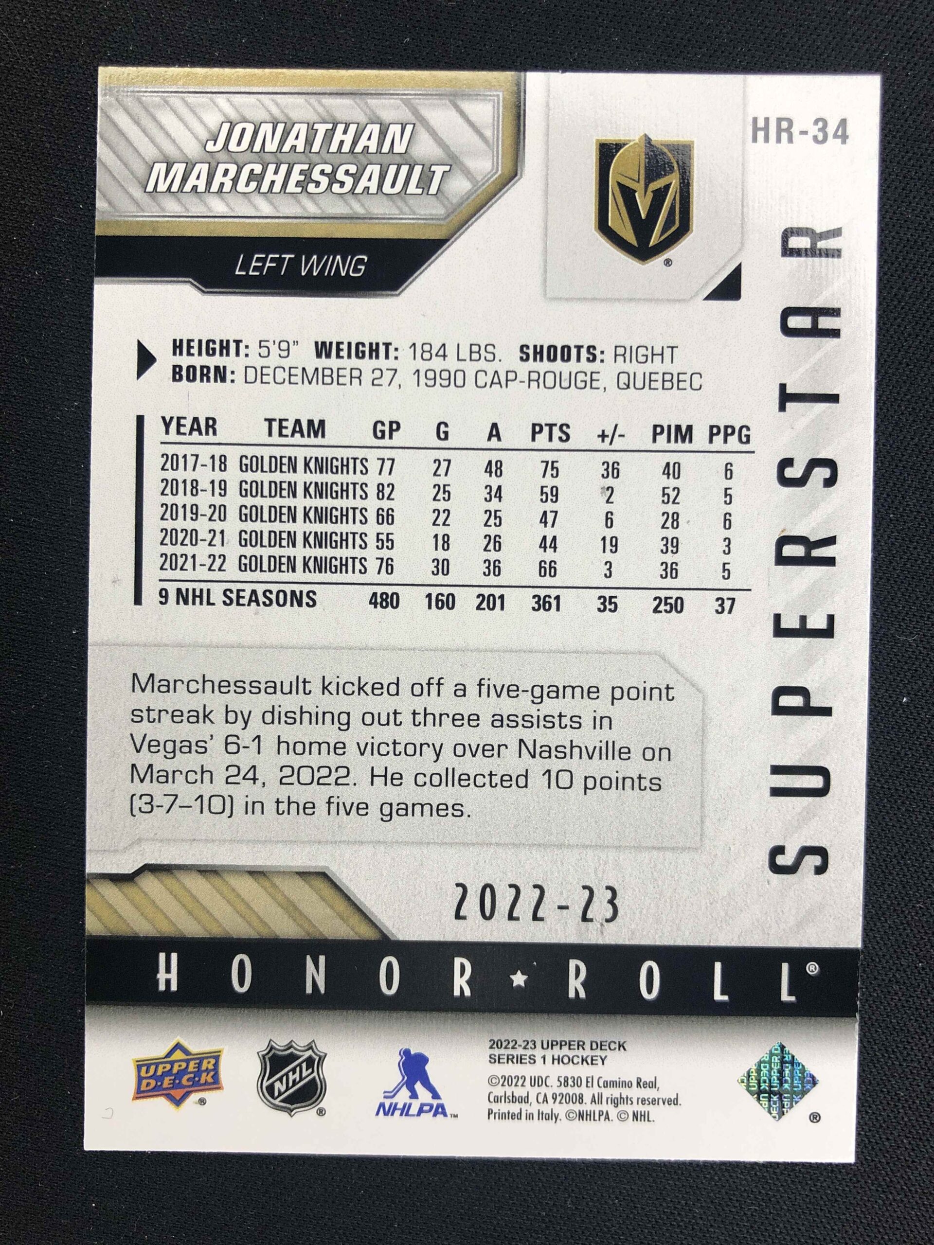 Sběratelská karta 2022/2023 Upper Deck Series 1 Honor Roll HR-34 Jonathan Marchessault Inzert