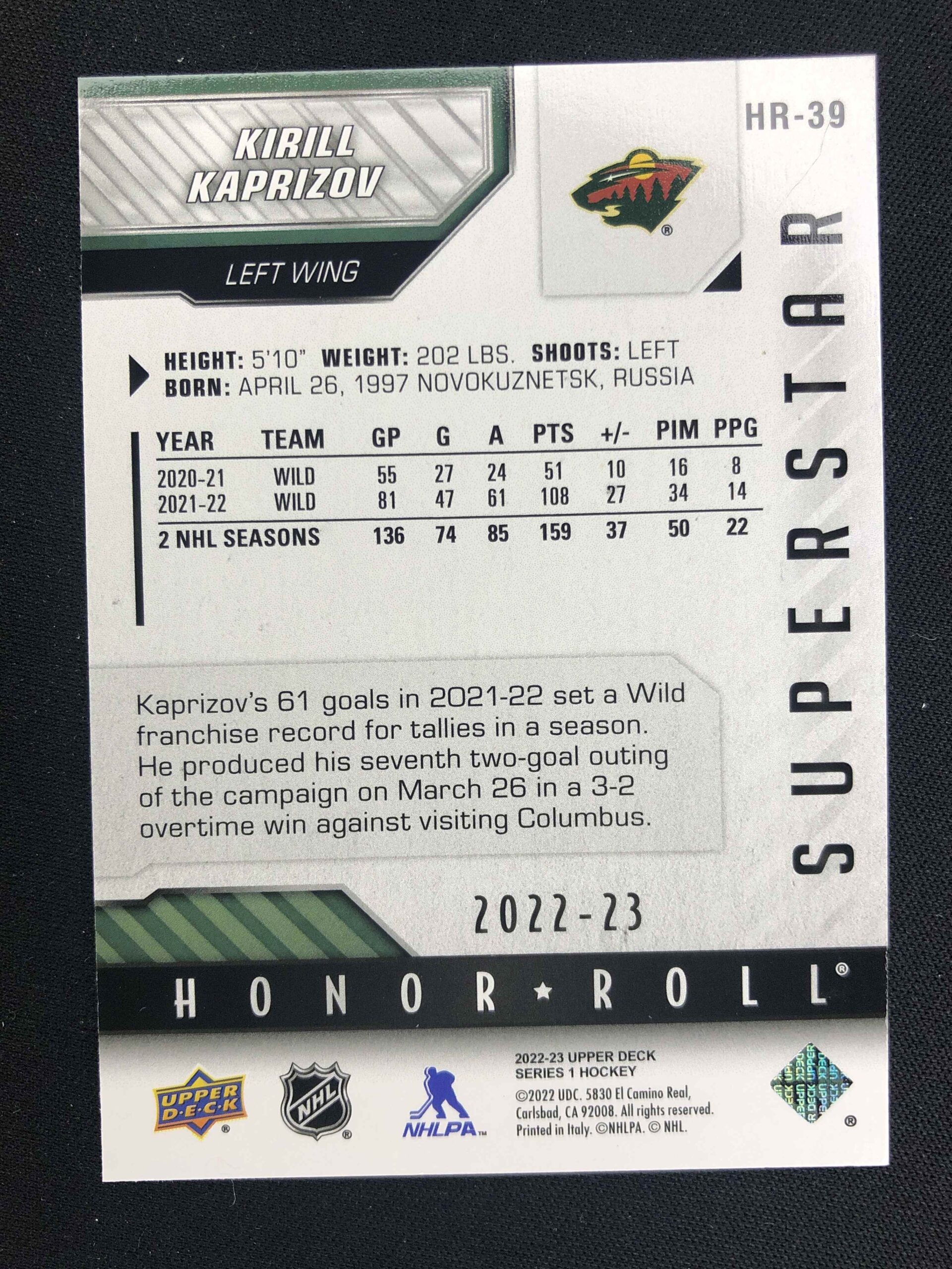 Sběratelská karta 2022/2023 Upper Deck Series 1 Honor Roll HR-39 Kirill Kaprizov Inzert