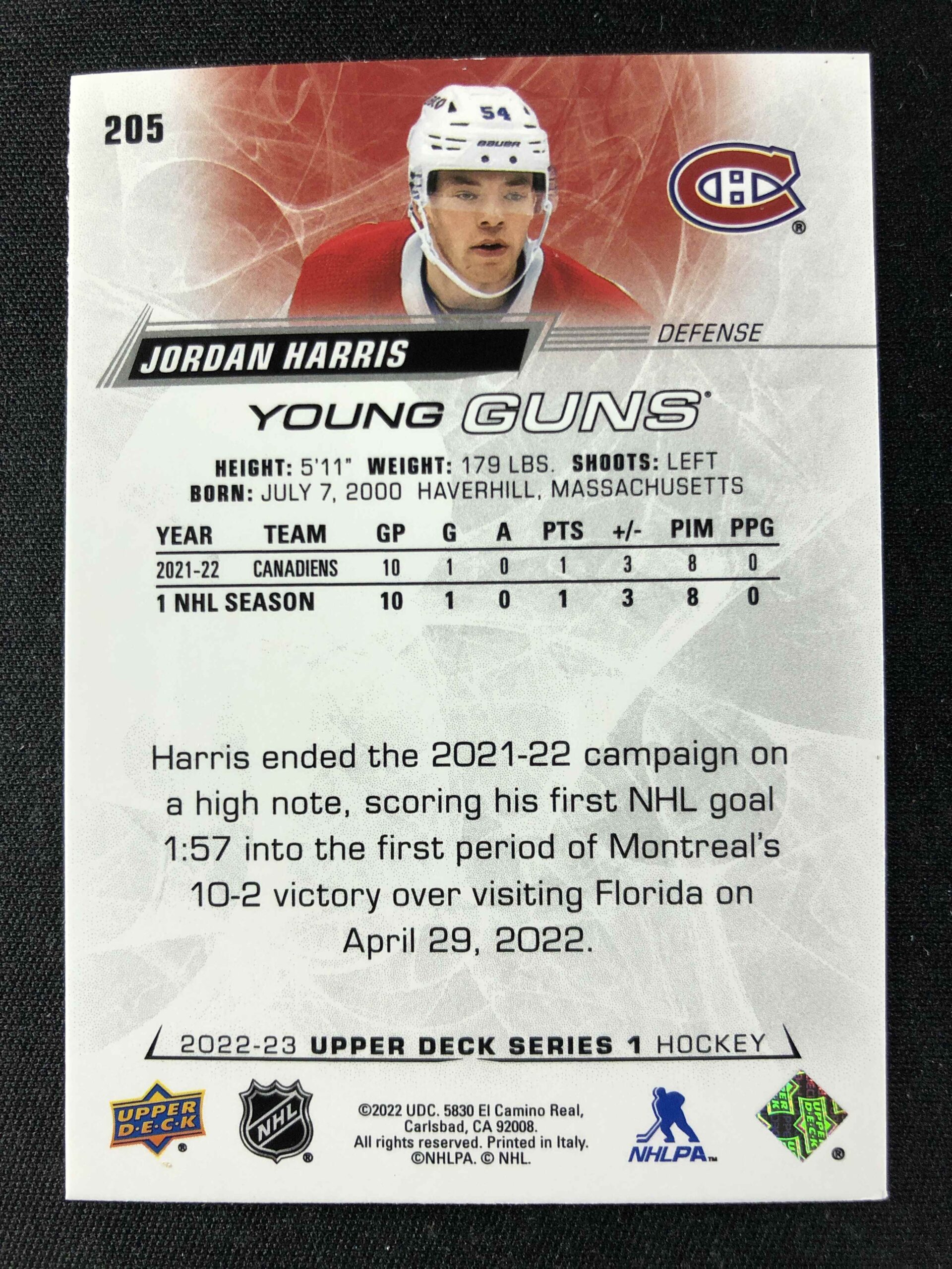 2022/2023 Upper Deck Series 1 Young Guns 205 Jordan Harris Inzert