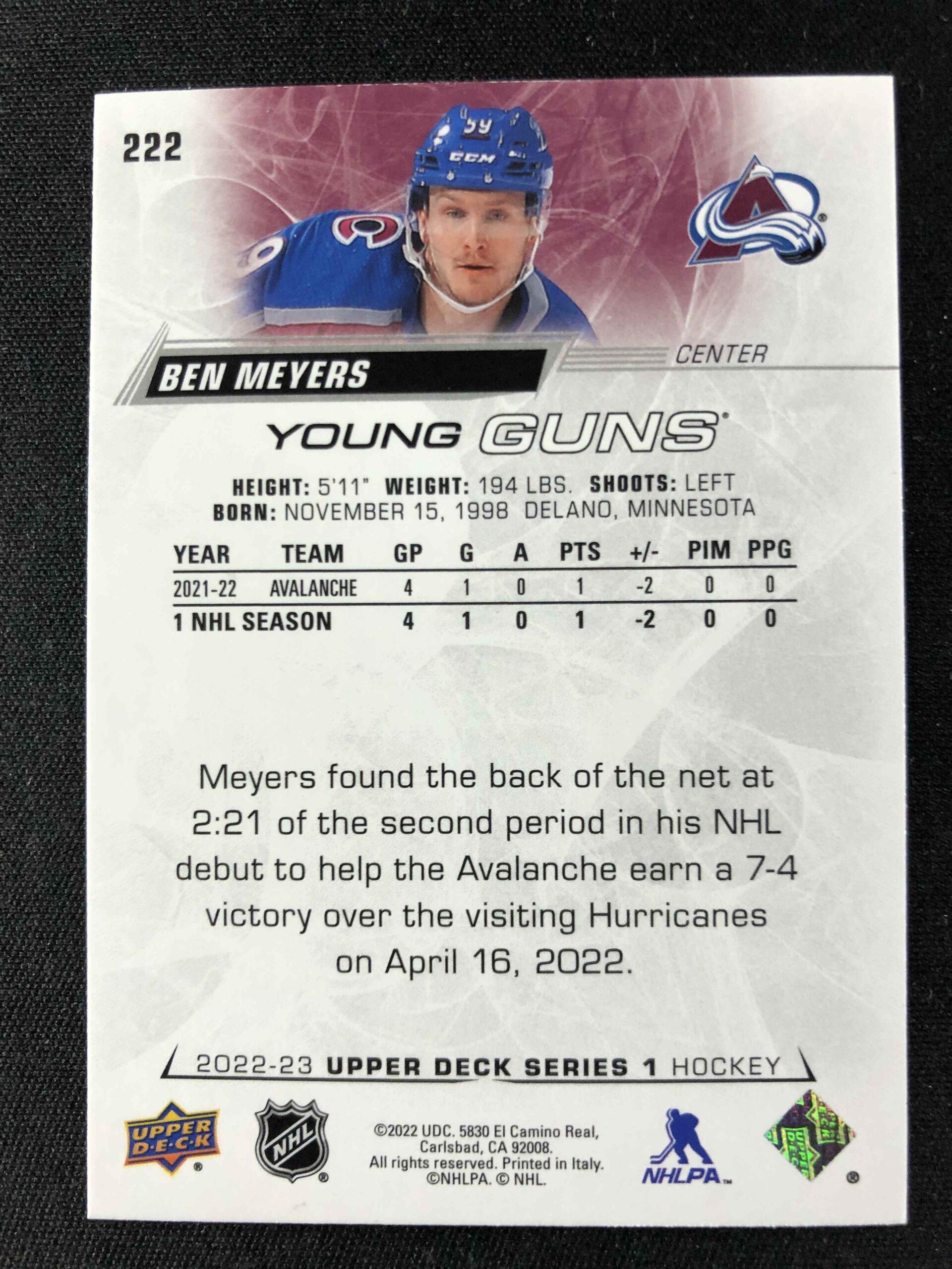 Sběratelská karta 2022/2023 Upper Deck Series 1 Young Guns 222 Ben Meyers Inzert