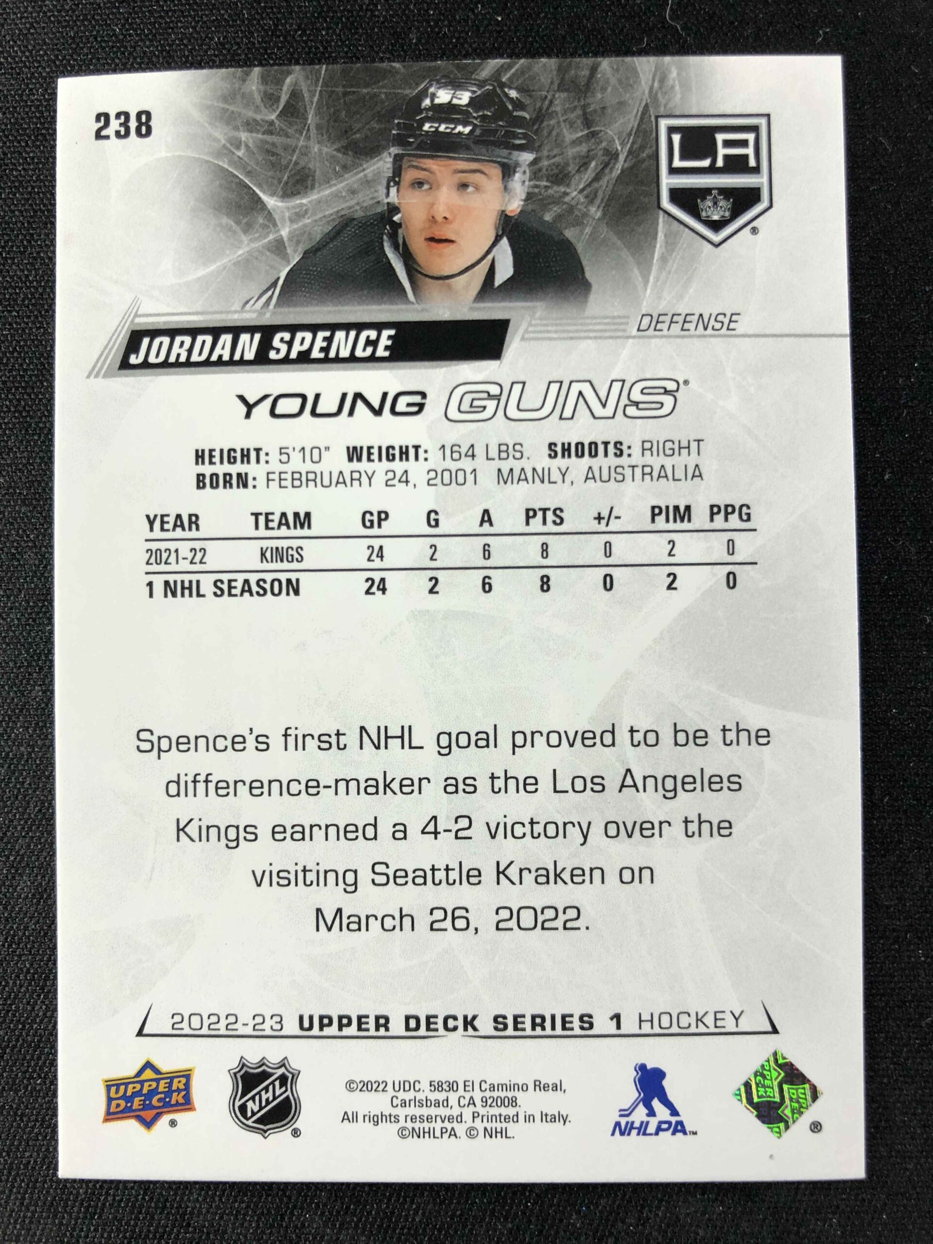 Sběratelská karta 2022/2023 Upper Deck Series 1 Young Guns 238 Jordan Spence Inzert