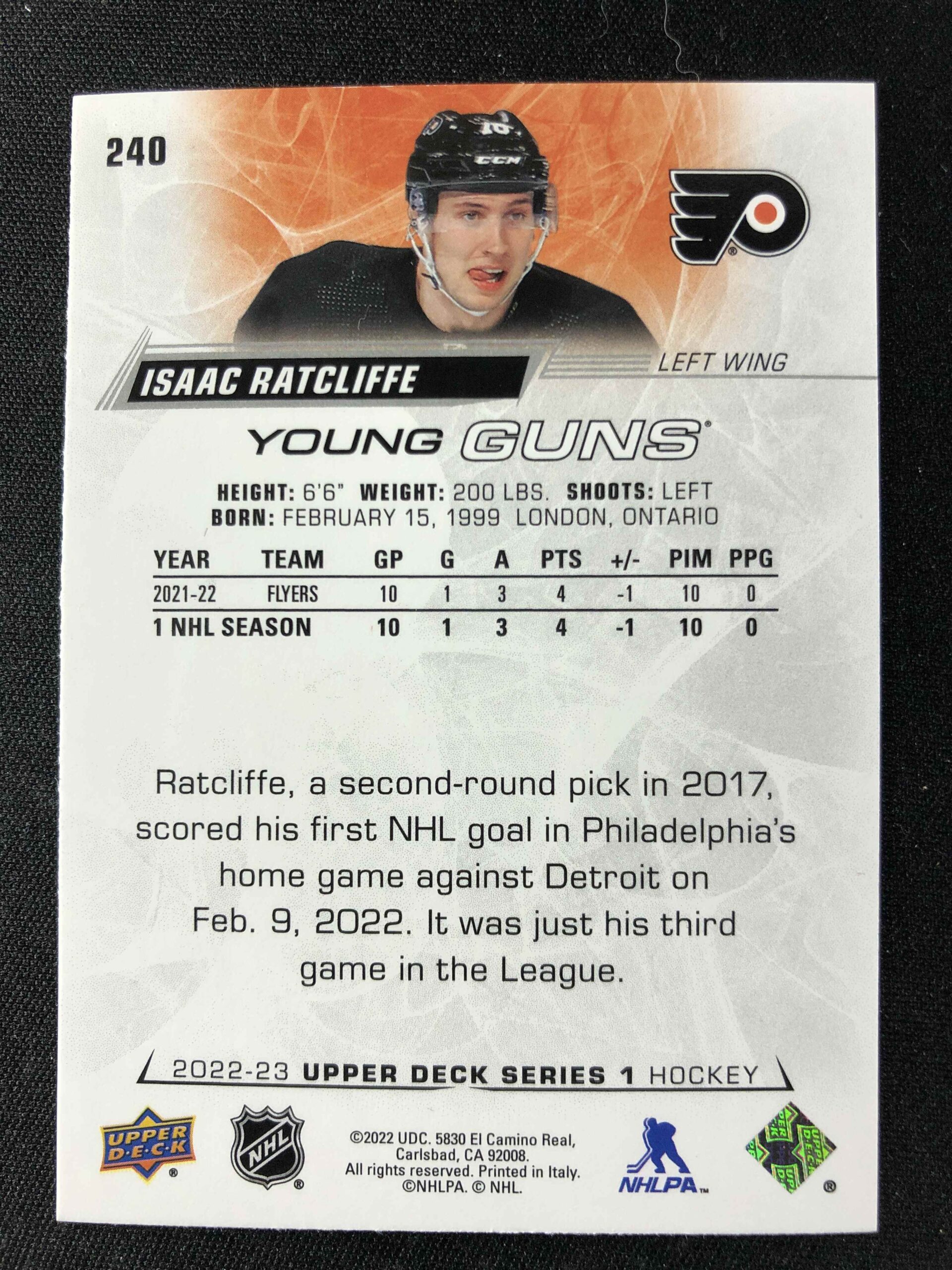 Sběratelská karta 2022/2023 Upper Deck Series 1 Young Guns 240 Isaac Ratcliffe Inzert