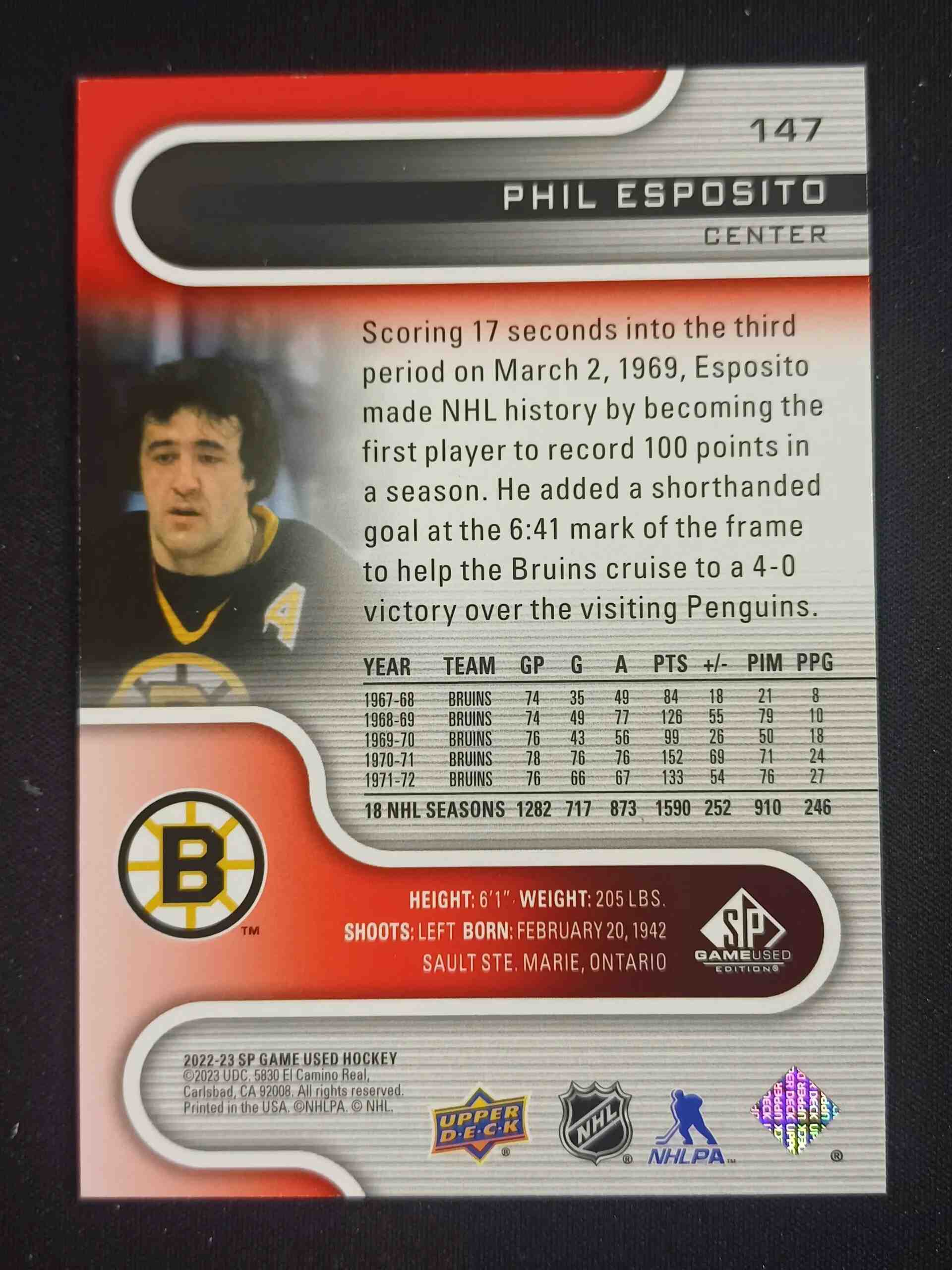 Sběratelská karta 2022/2023 Upper Deck SPGU Red 147 Phil Esposito Paralel 227/281