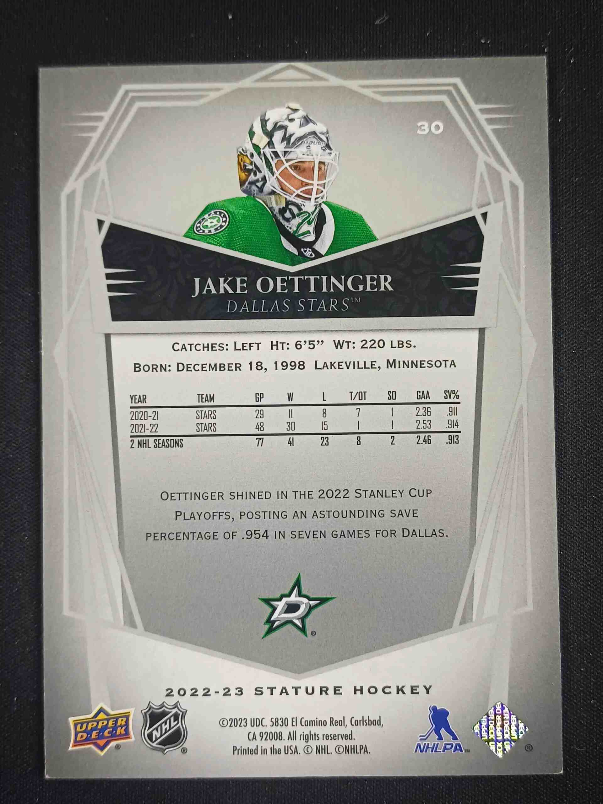 Sběratelská karta 2022/2023 Upper Deck Stature Design Variant 30 Jake Oettinger Paralel 40/65