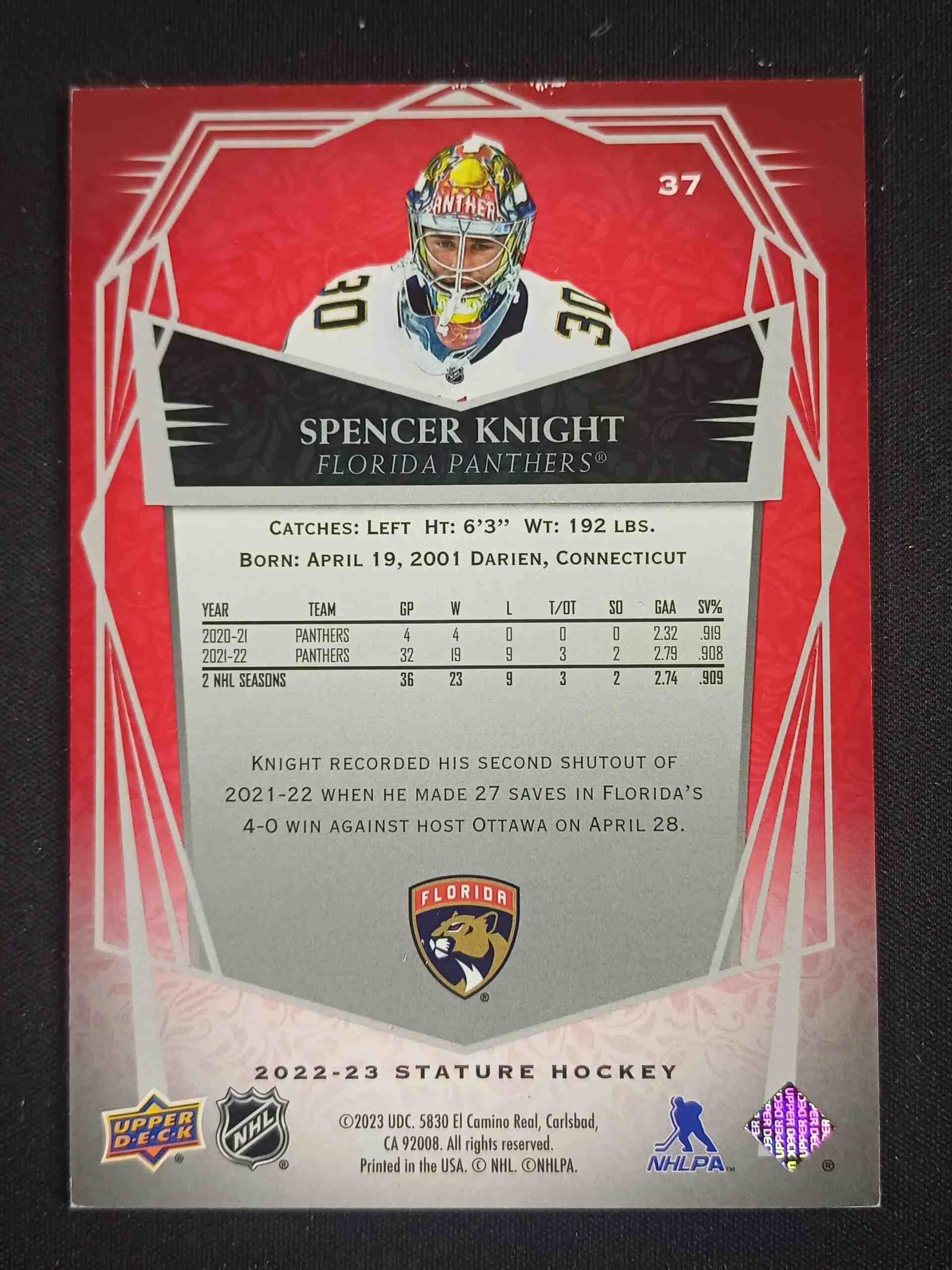 Sběratelská karta 2022/2023 Upper Deck Stature Photo Variant Red 37 Spencer Knight Paralel 06/11