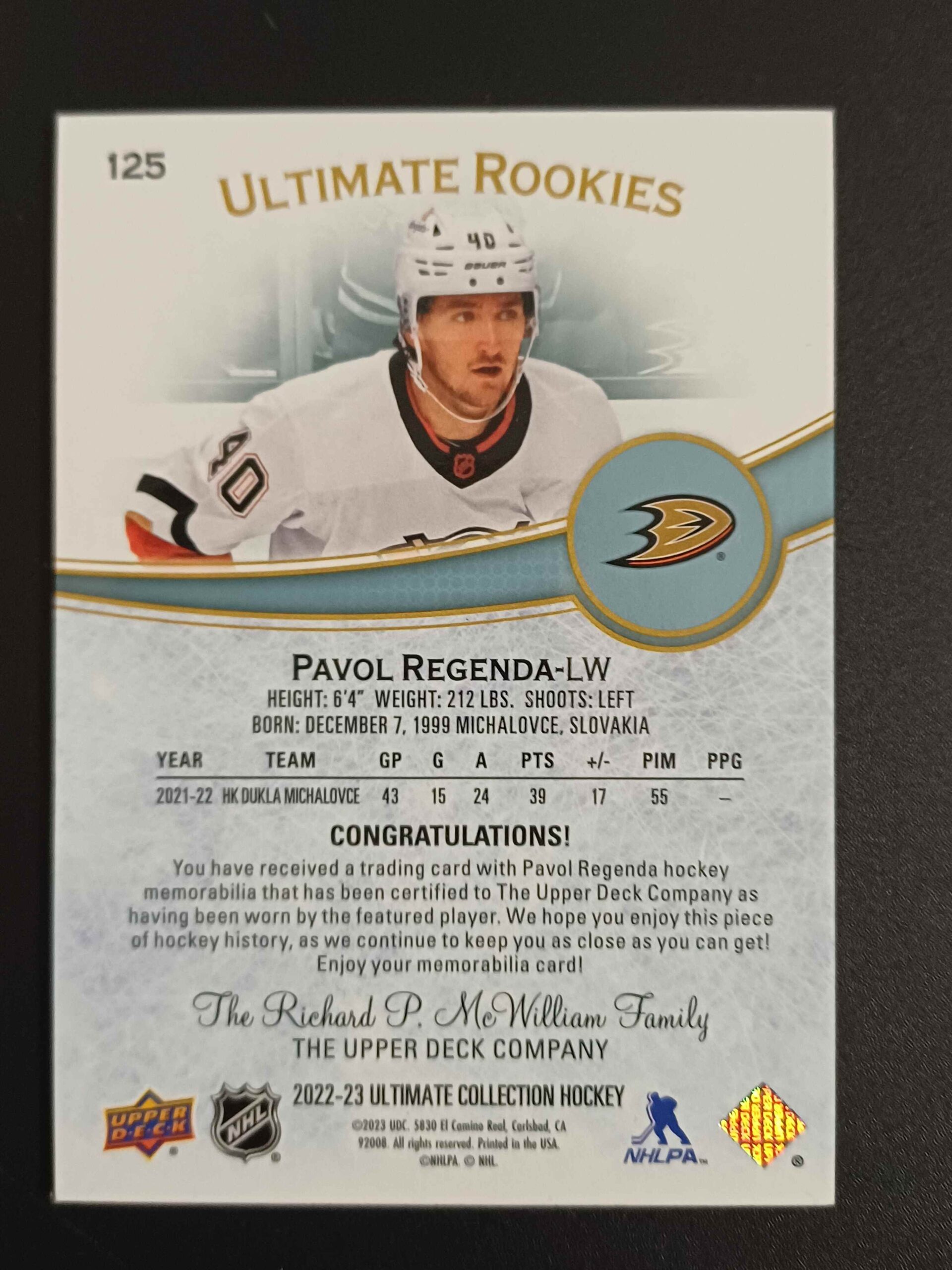 Sběratelská karta 2022/2023 Upper Deck Ultimate Collection Ultimate Rookies 125 Pavol Regenda Jersey 785/799