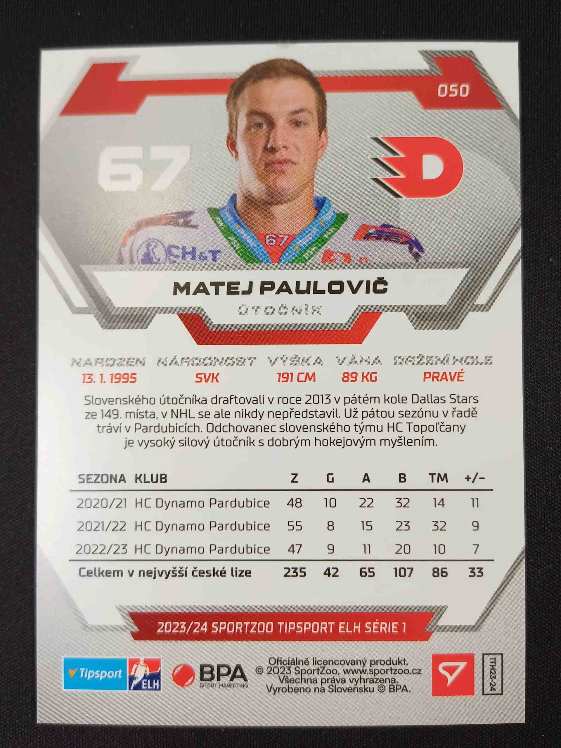 Sběratelská karta 2023/2024 Sportzoo Serie 1 Base 50 Matej Paulovič