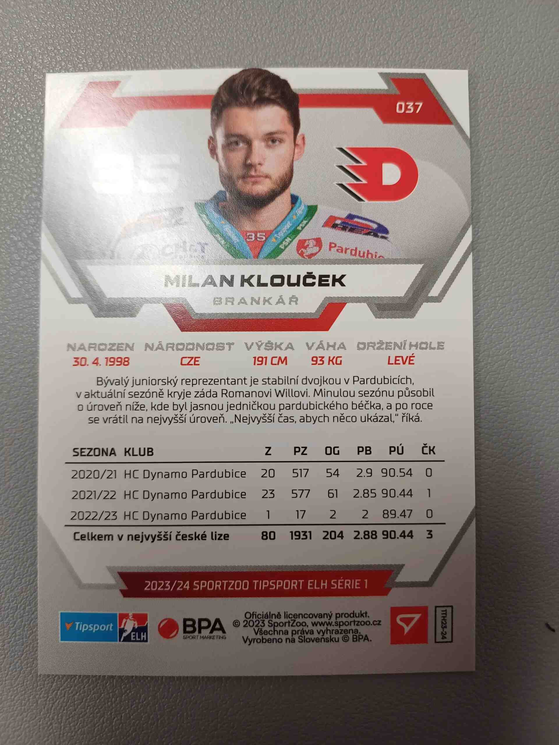 Sběratelská karta 2023/2024 Sportzoo Tipsport ELH Serie 1 Base 37 Milan Klouček