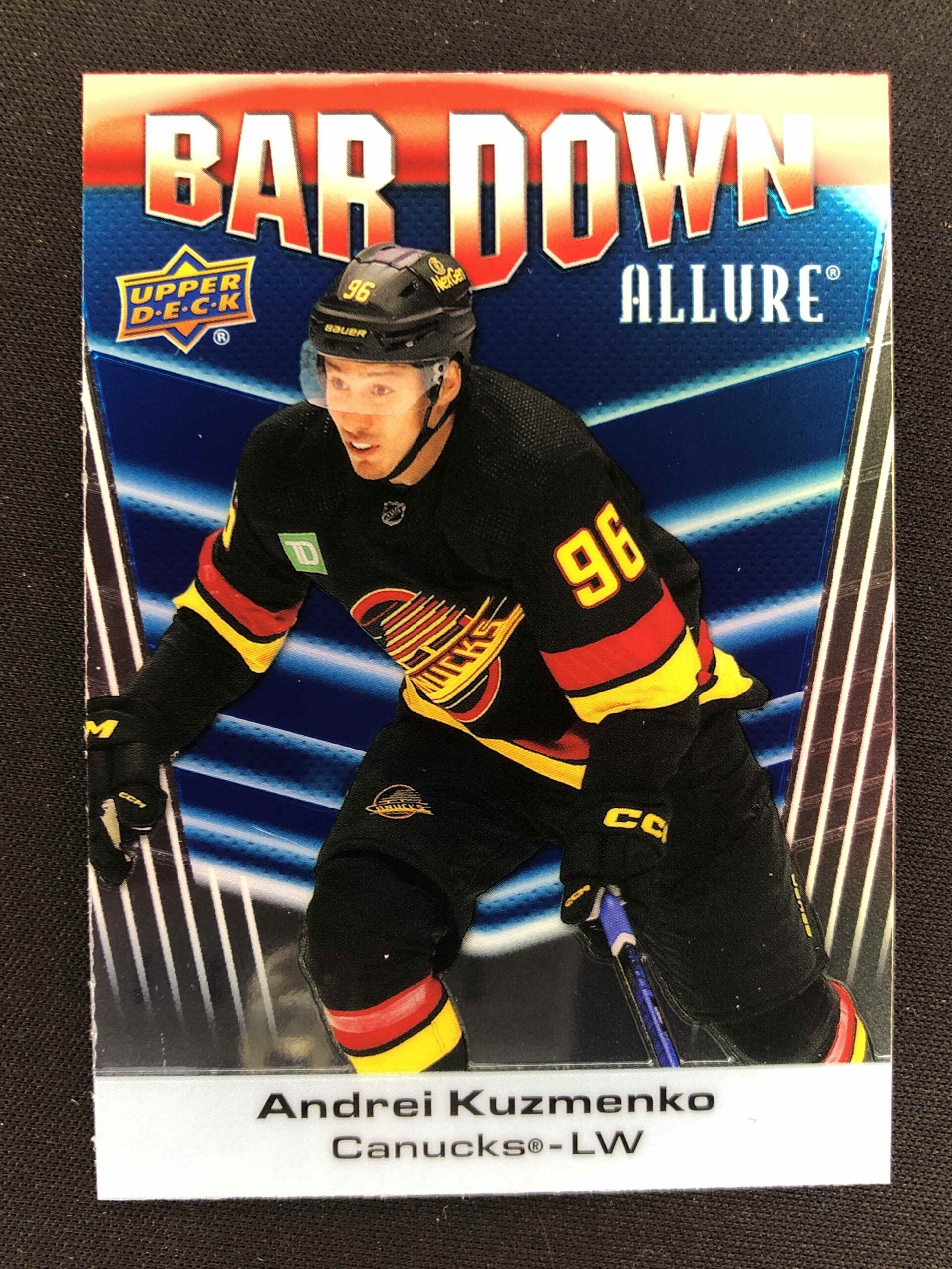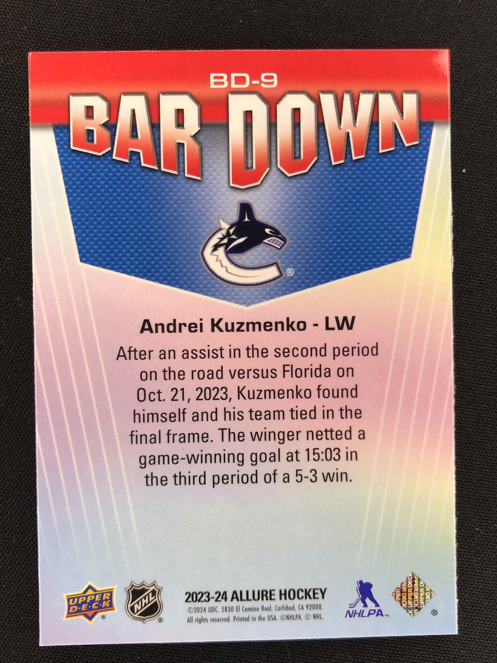 Sběratelská karta 2023/2024 Upper Deck Allure Bar Down BD-9 Andrei Kuzmenko Inzert