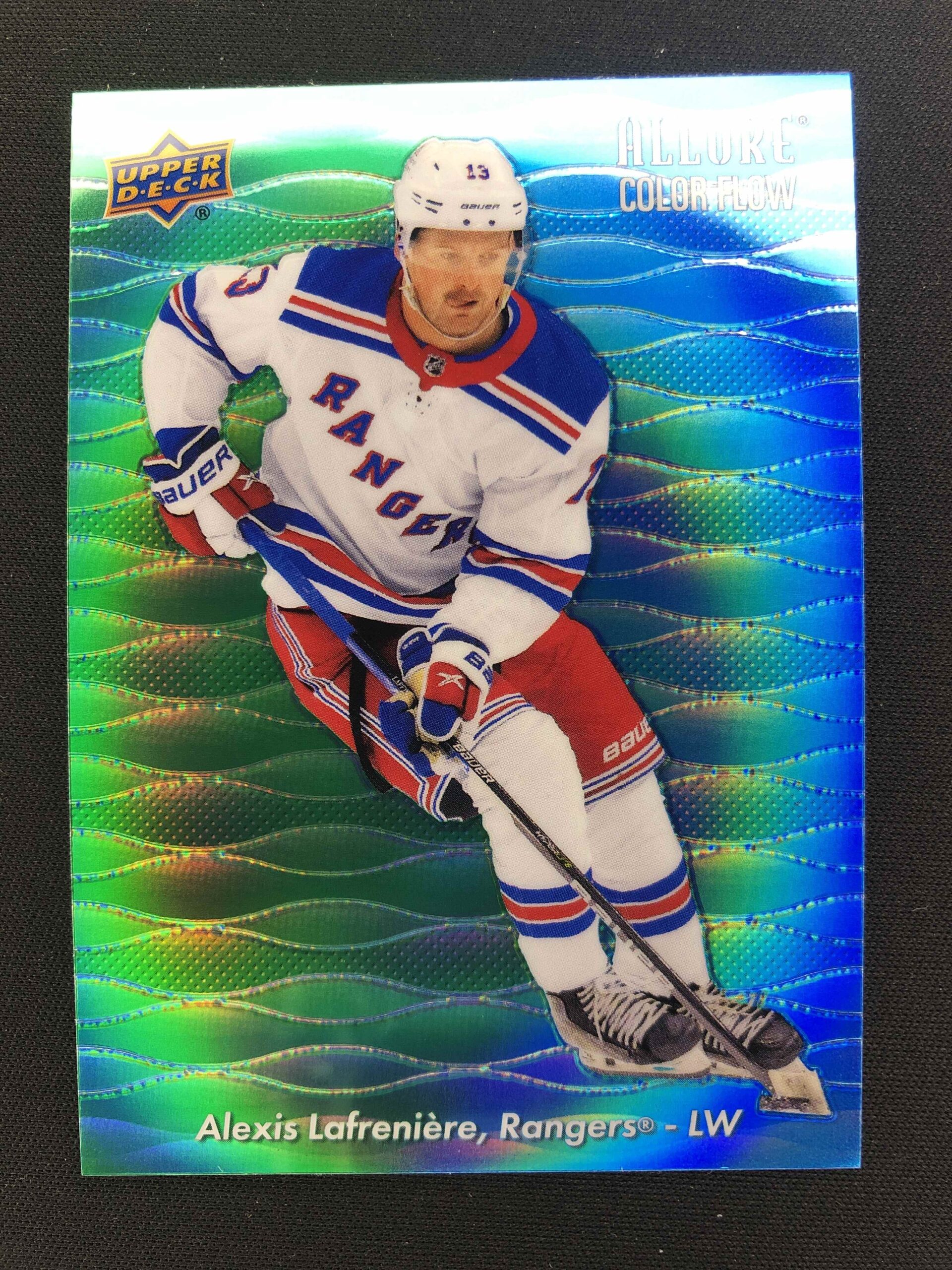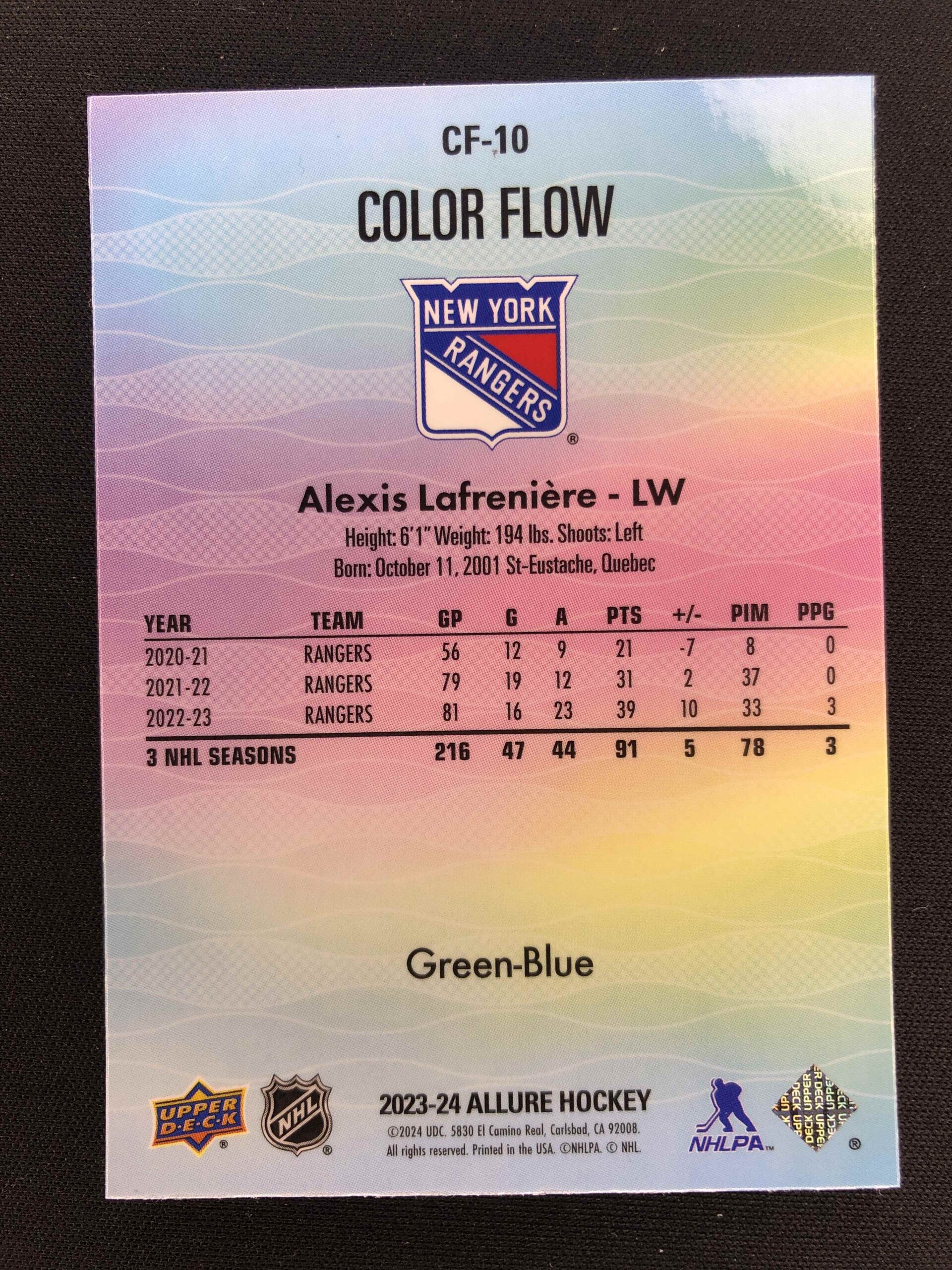 Sběratelská karta 2023/2024 Upper Deck Allure Color Flow – Green Blue CF-10 Alexis Lafreniere Paralel