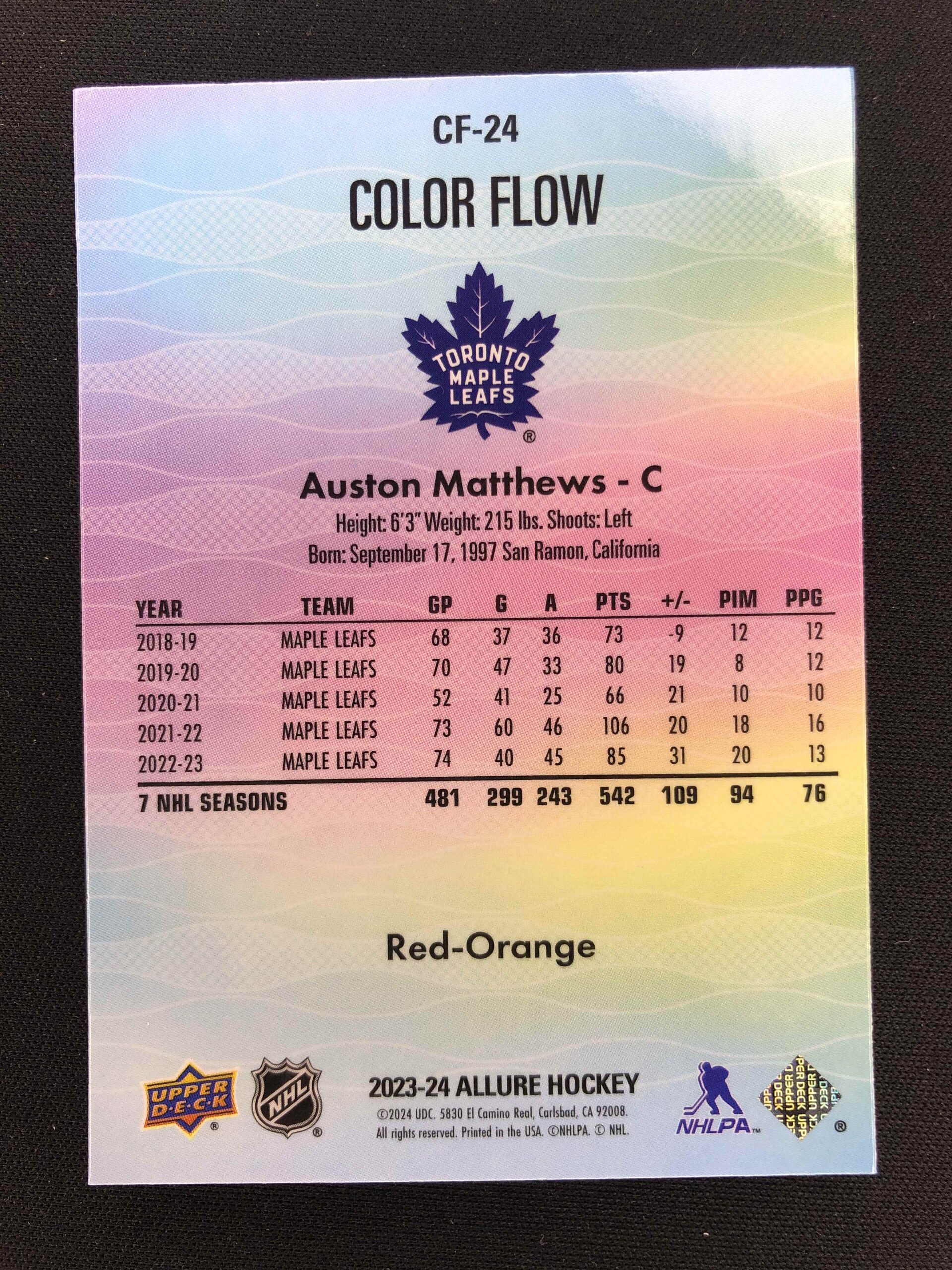 Sběratelská karta 2023/2024 Upper Deck Allure Color Flow – Red Orange CF-24 Auston Matthews Paralel