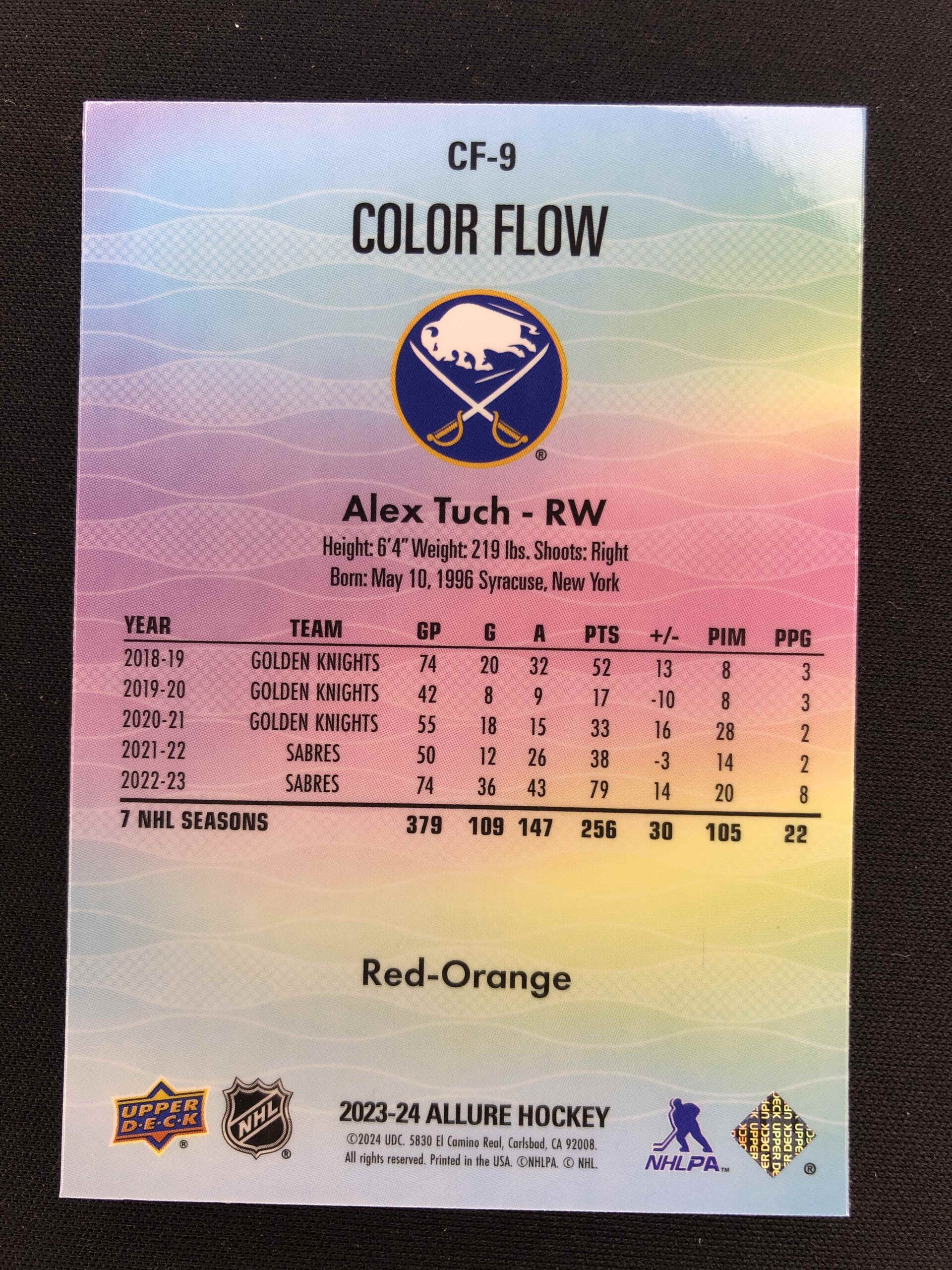 Sběratelská karta 2023/2024 Upper Deck Allure Color Flow – Red Orange CF-9 Alex Tuch Paralel