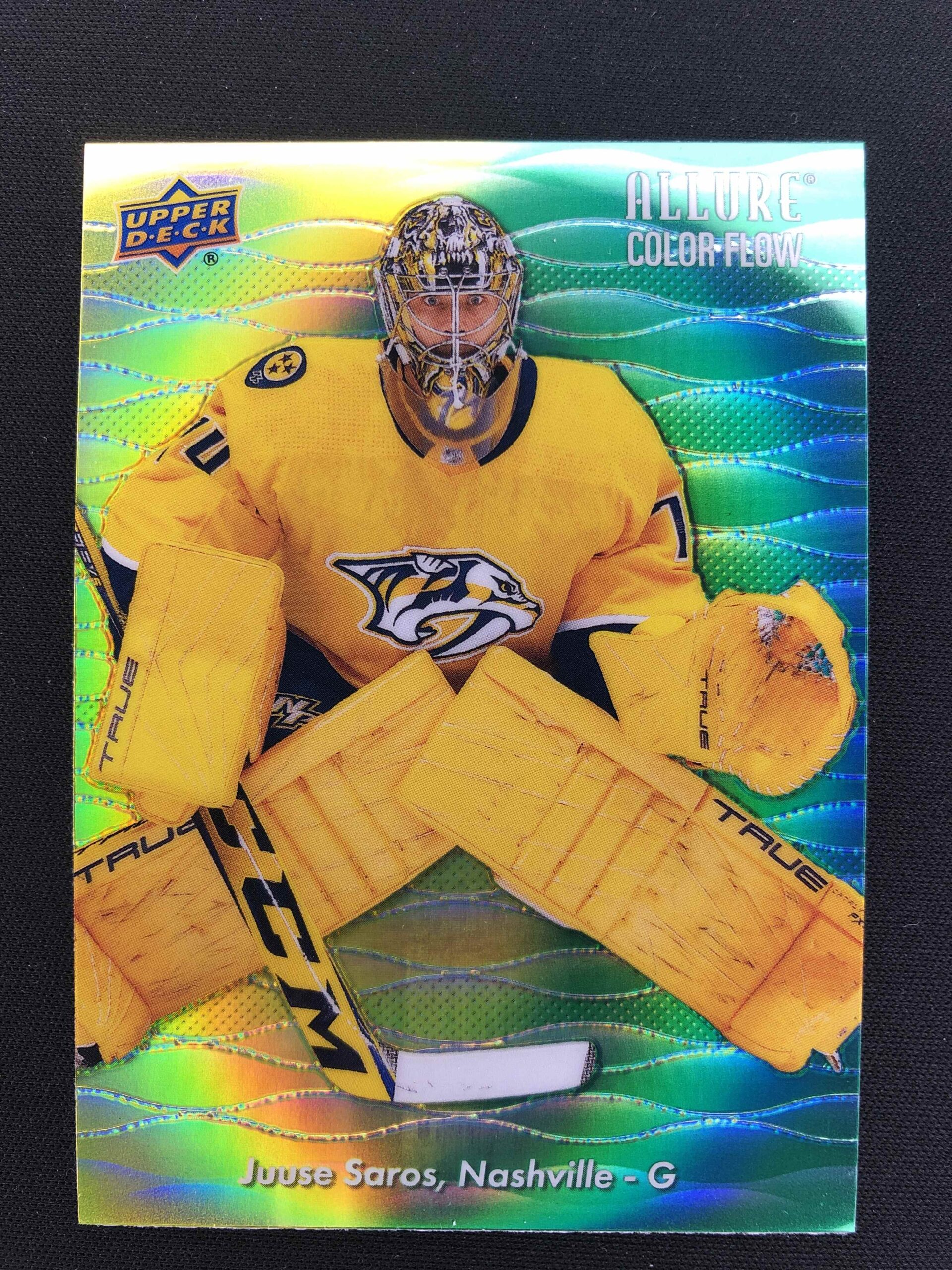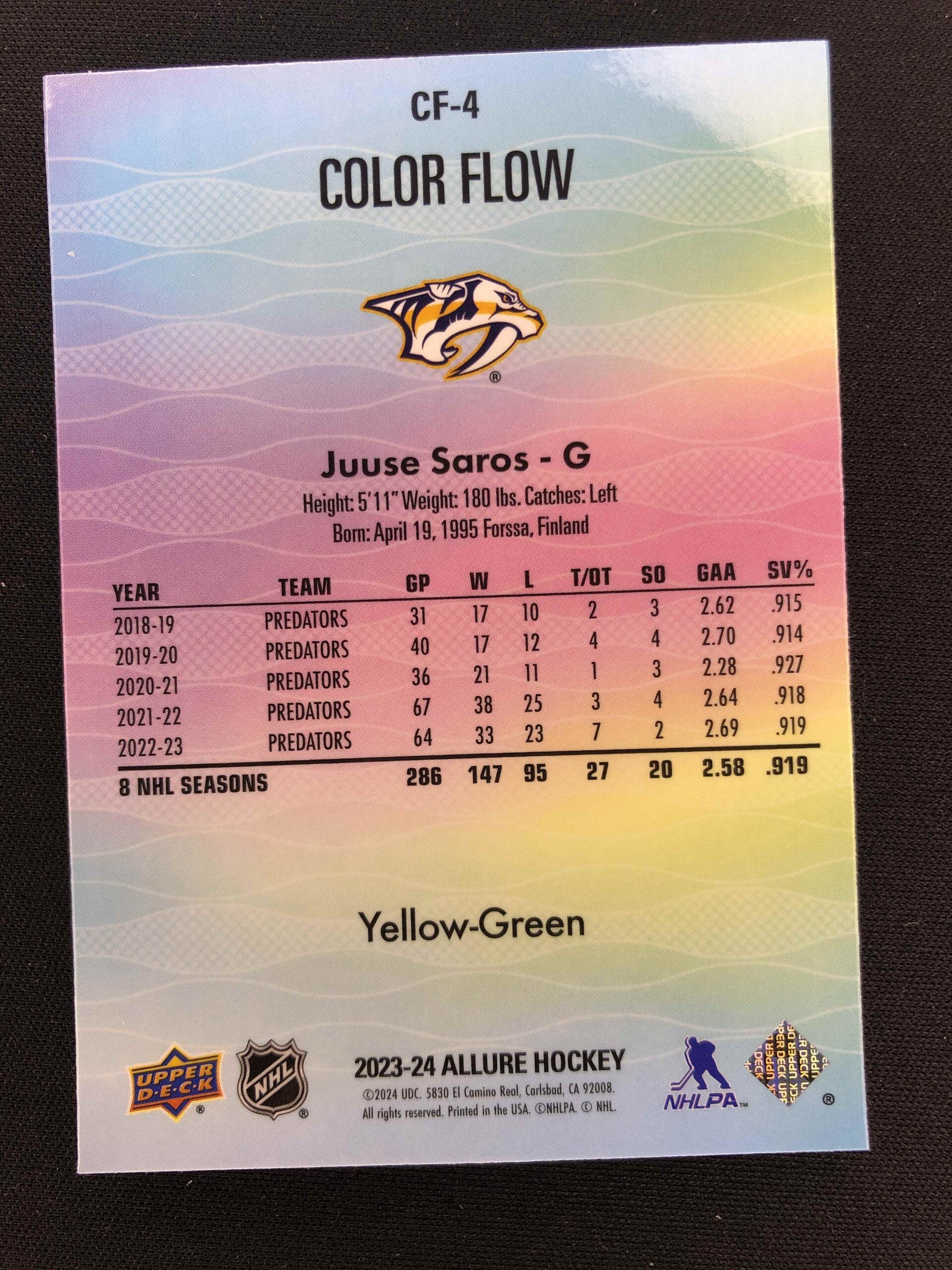 Sběratelská karta 2023/2024 Upper Deck Allure Color Flow – Yellow Green CF-4 Juuse Saros Paralel