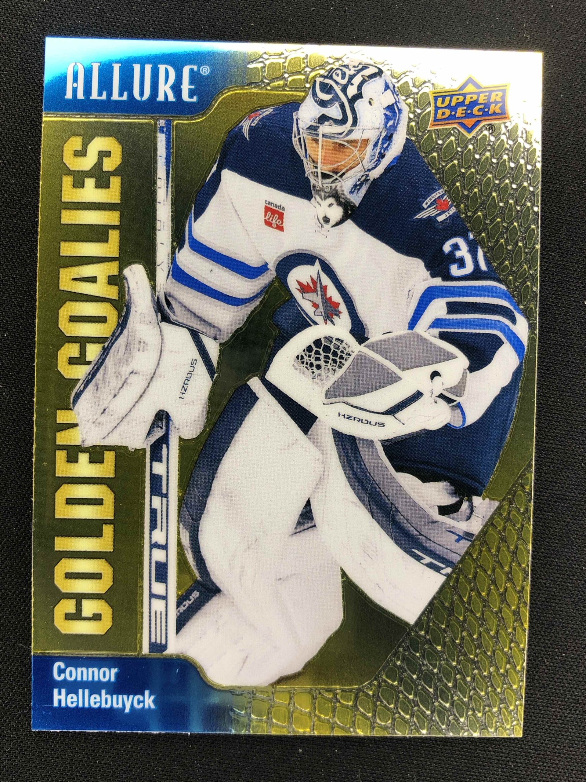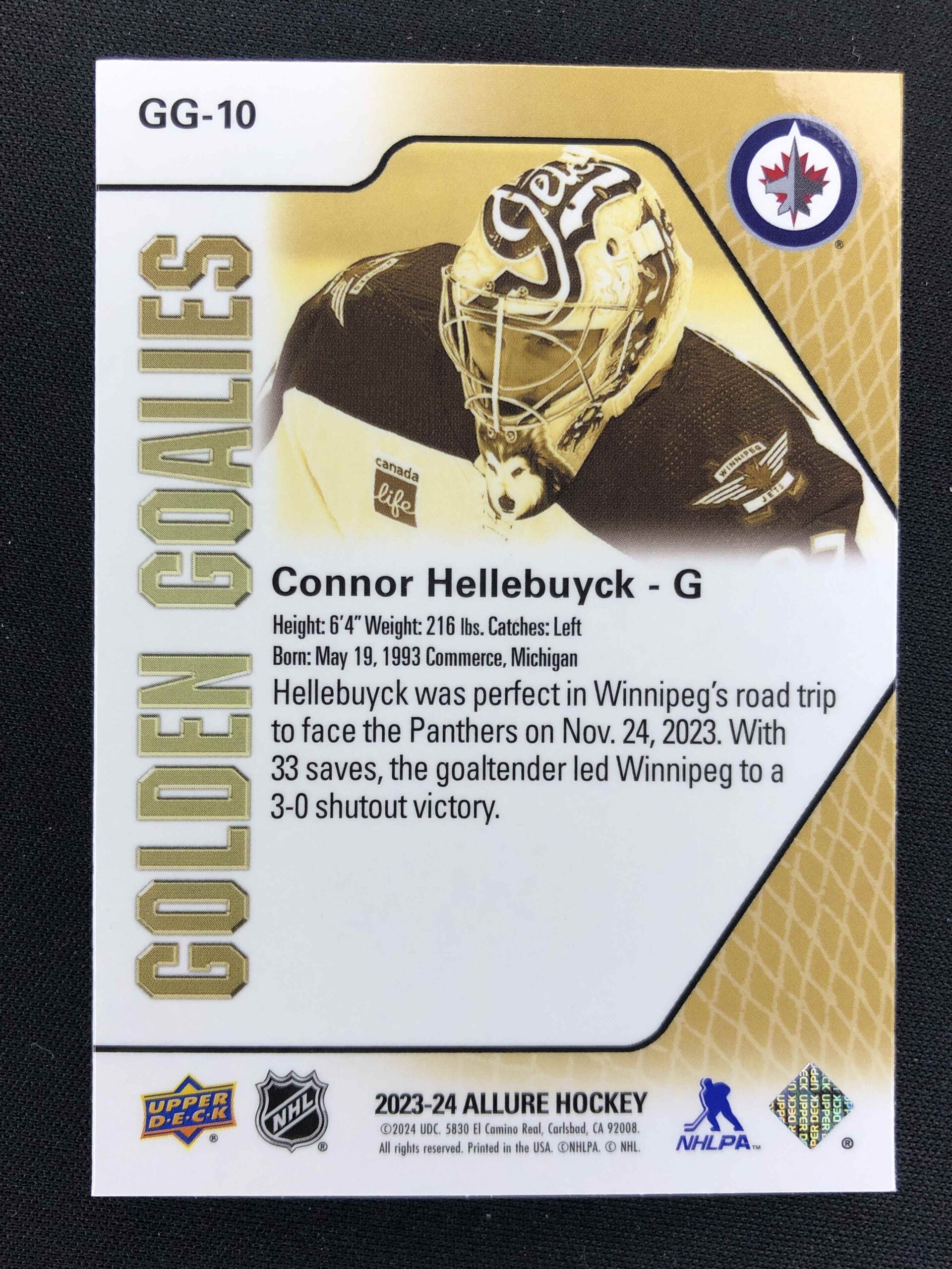 Sběratelská karta 2023/2024 Upper Deck Allure Golden Goalies GG-10 Connor Hellebuyck Inzert