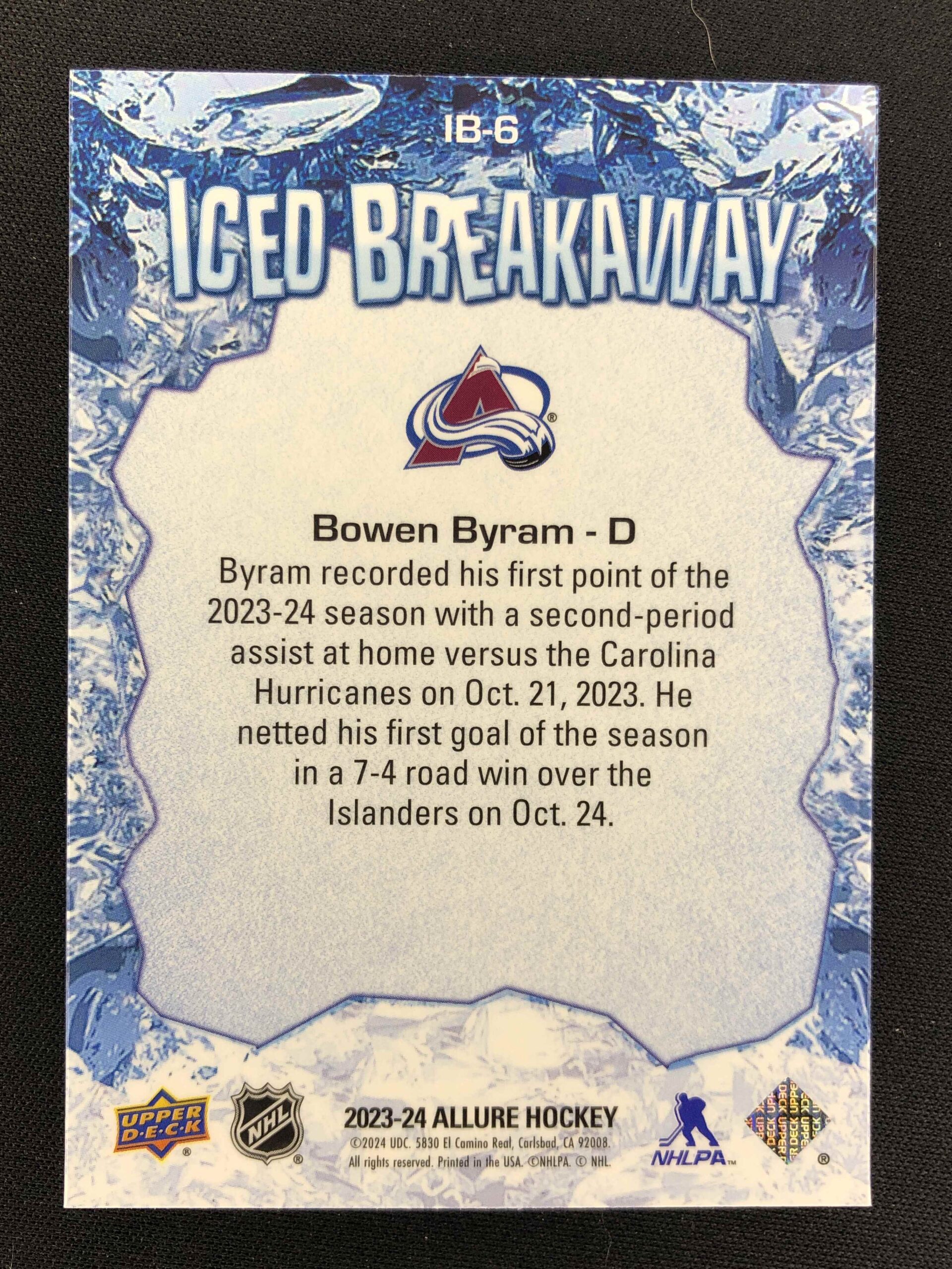 Sběratelská karta 2023/2024 Upper Deck Allure Iced Breakaway IB-6 Bowen Byram Inzert