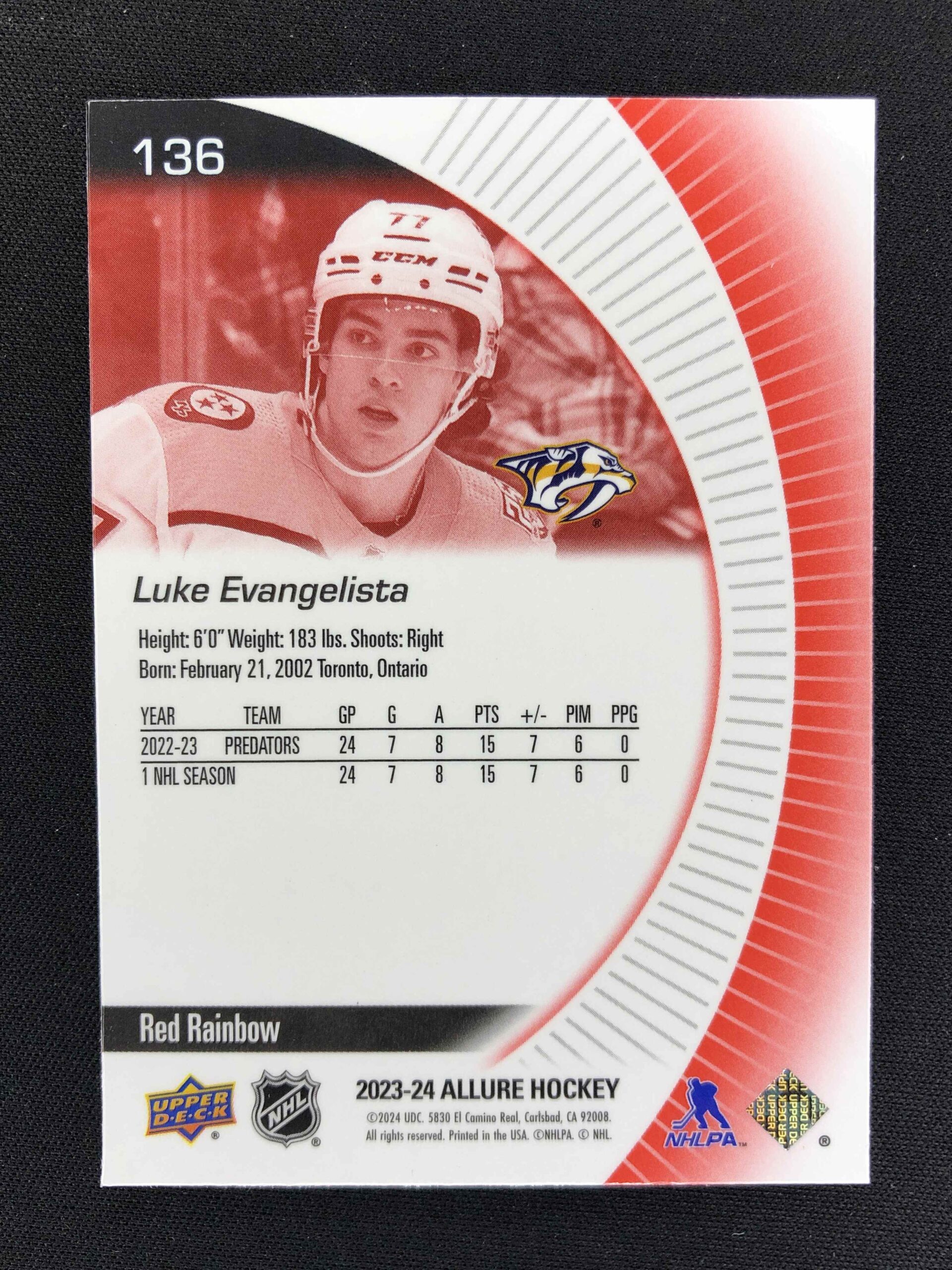 Sběratelská karta 2023/2024 Upper Deck Allure Red Rainbow 136 Luke Evangelista Paralel