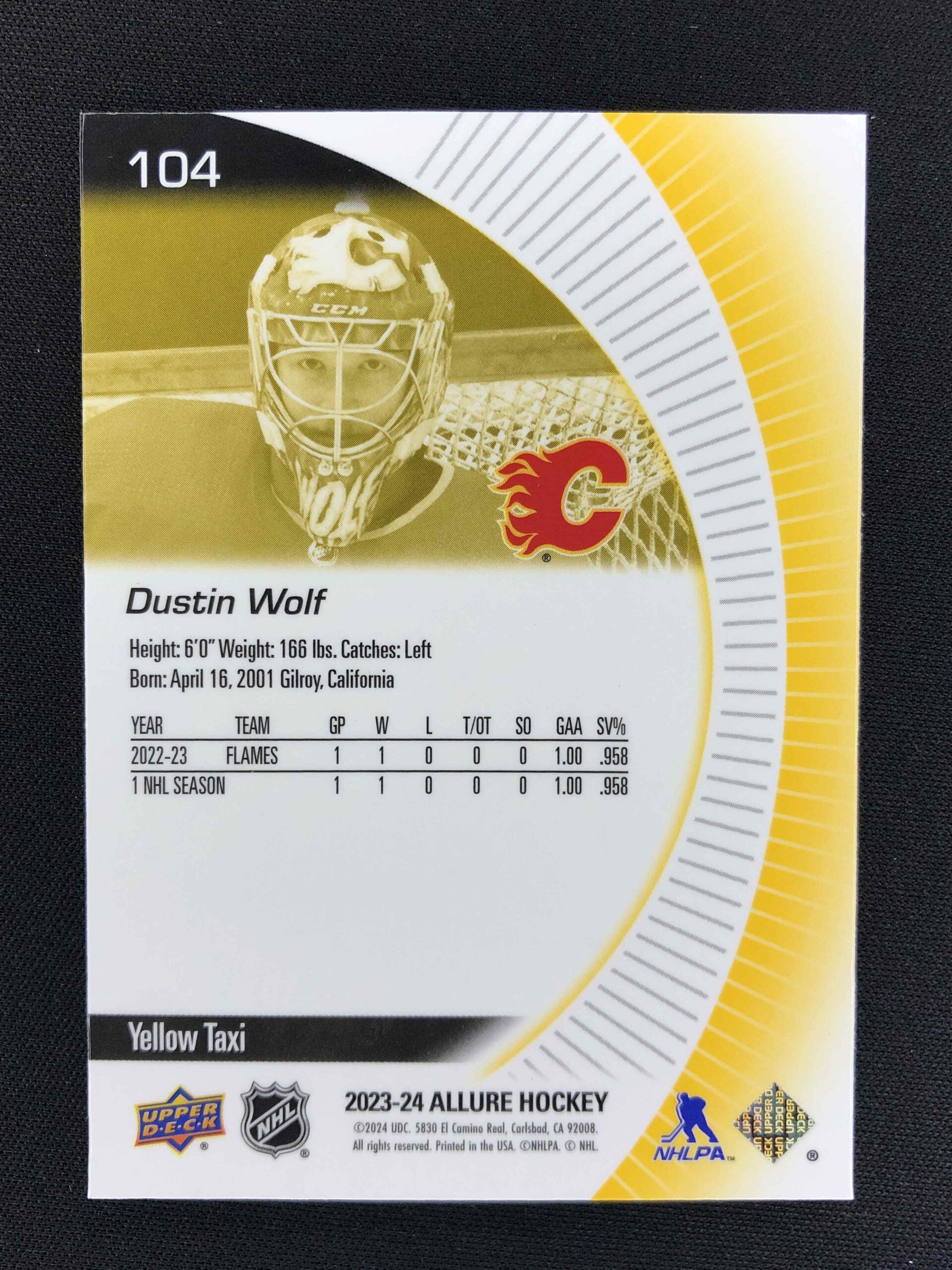 Sběratelská karta 2023/2024 Upper Deck Allure Yellow Taxi 104 Dustin Wolf Paralel