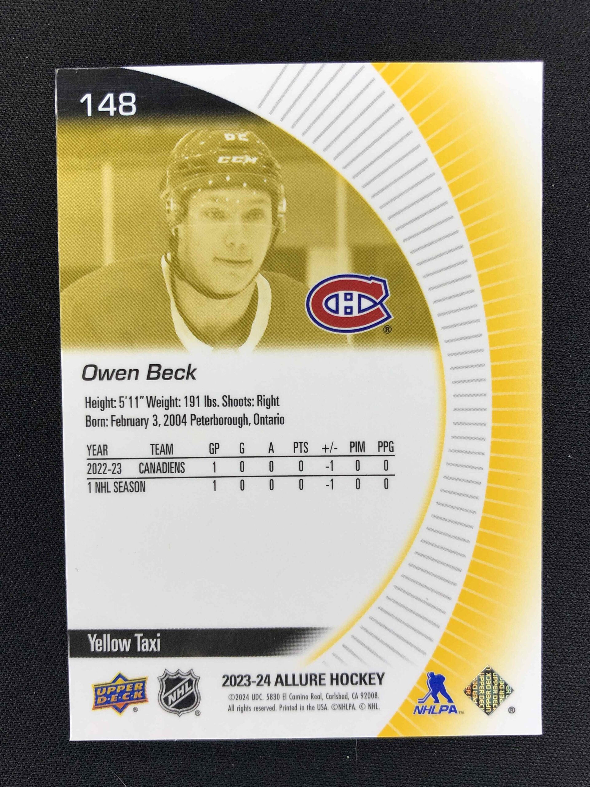Sběratelská karta 2023/2024 Upper Deck Allure Yellow Taxi 148 Owen Beck Paralel