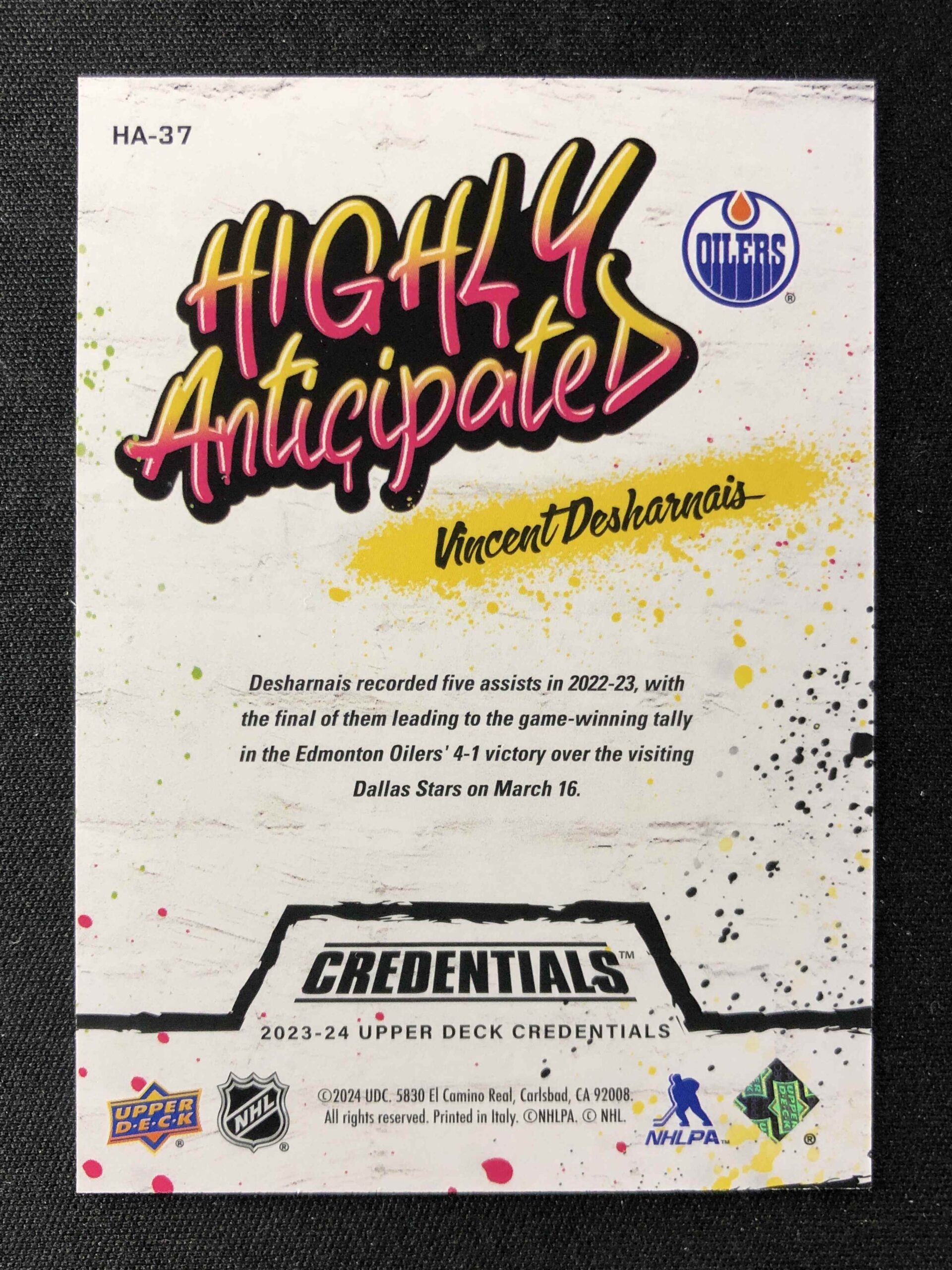 Sběratelská karta 2023/2024 Upper Deck Credentials Highly Anticipated HA-37 Vincent Desharnais Inzert