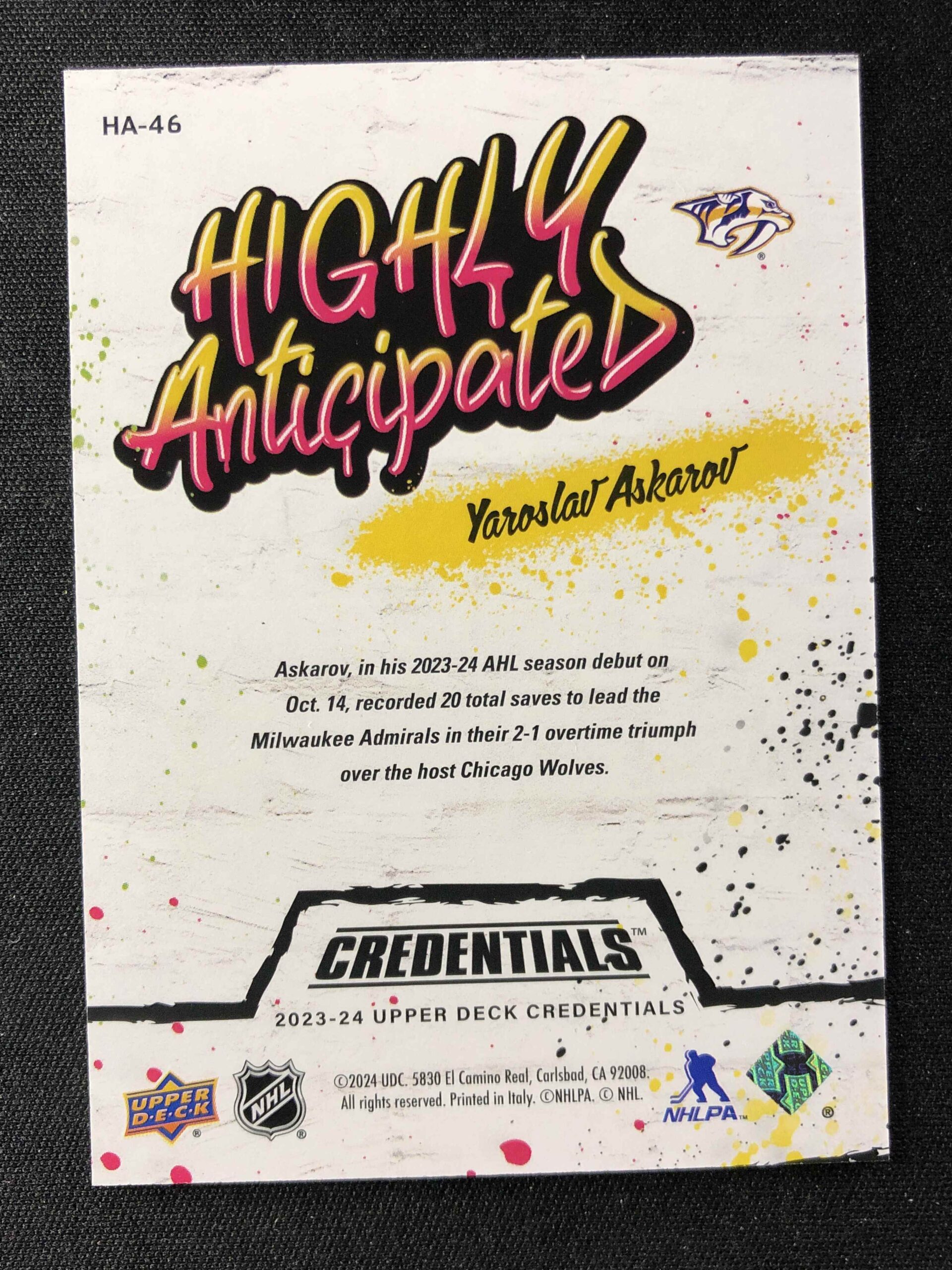 Sběratelská karta 2023/2024 Upper Deck Credentials Highly Anticipated HA-46 Yaroslav Askarov Inzert