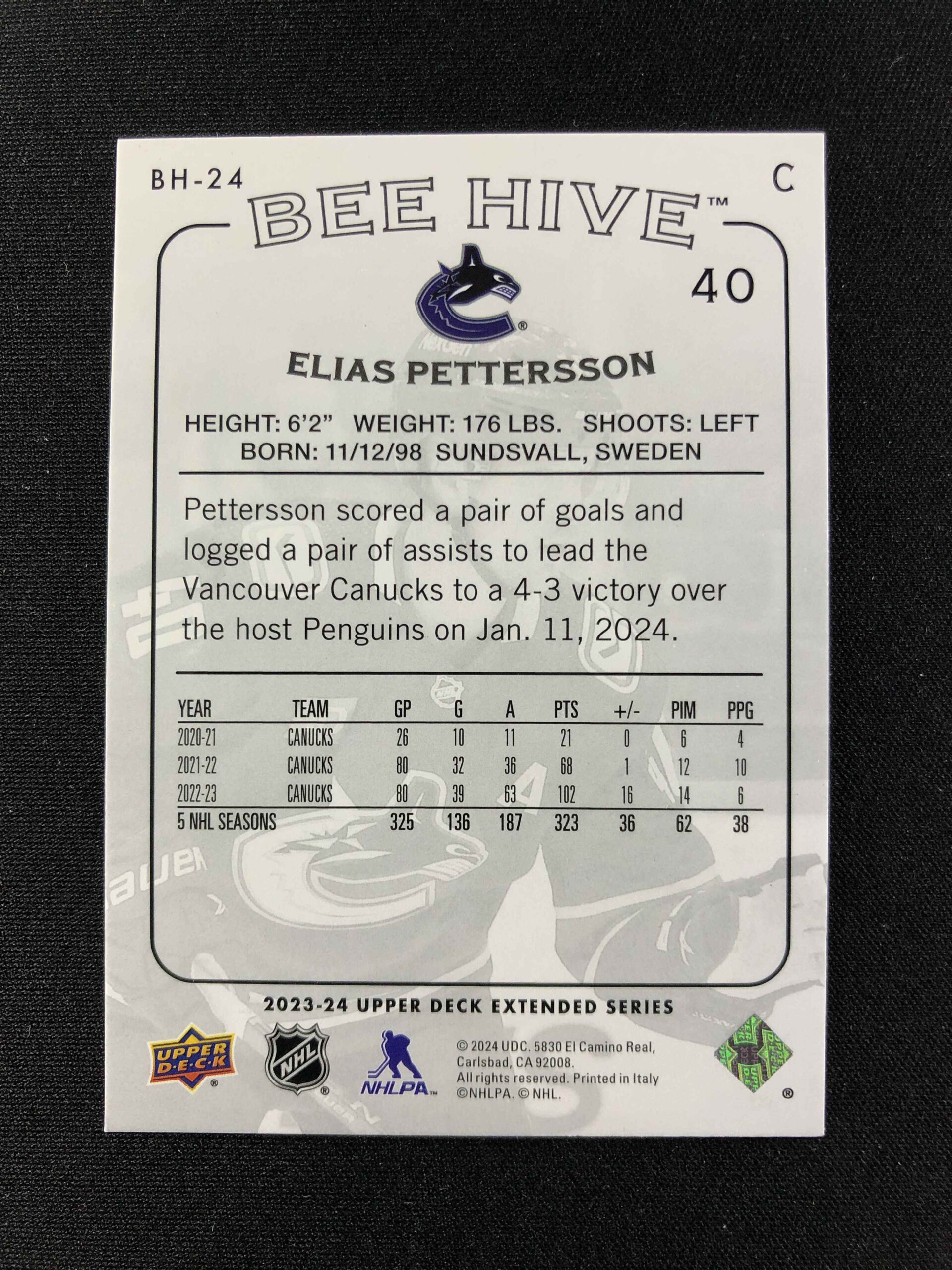 Sběratelská karta 2023/2024 Upper Deck Extended Bee Hive BH-24 Elias Pettersson Inzert
