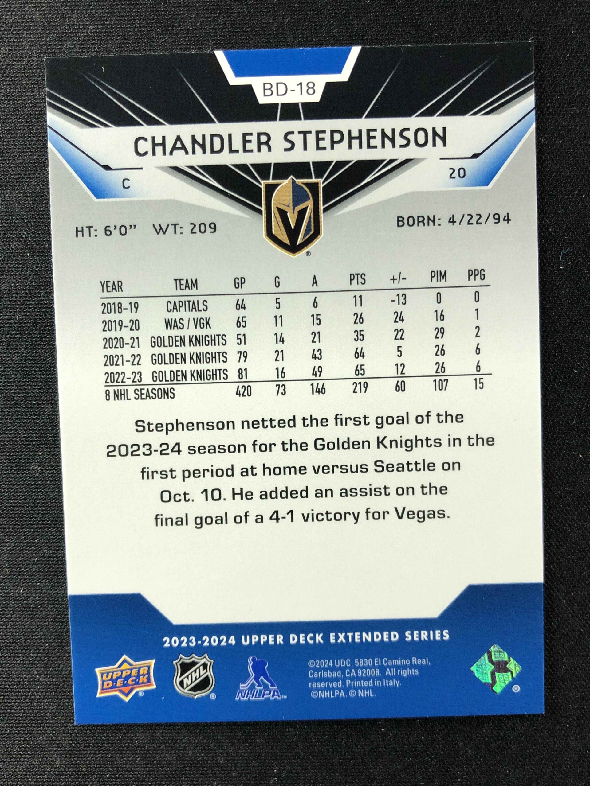 Sběratelská karta 2023/2024 Upper Deck Extended Black Diamond Retro BD-18 Chandler Stephenson Inzert