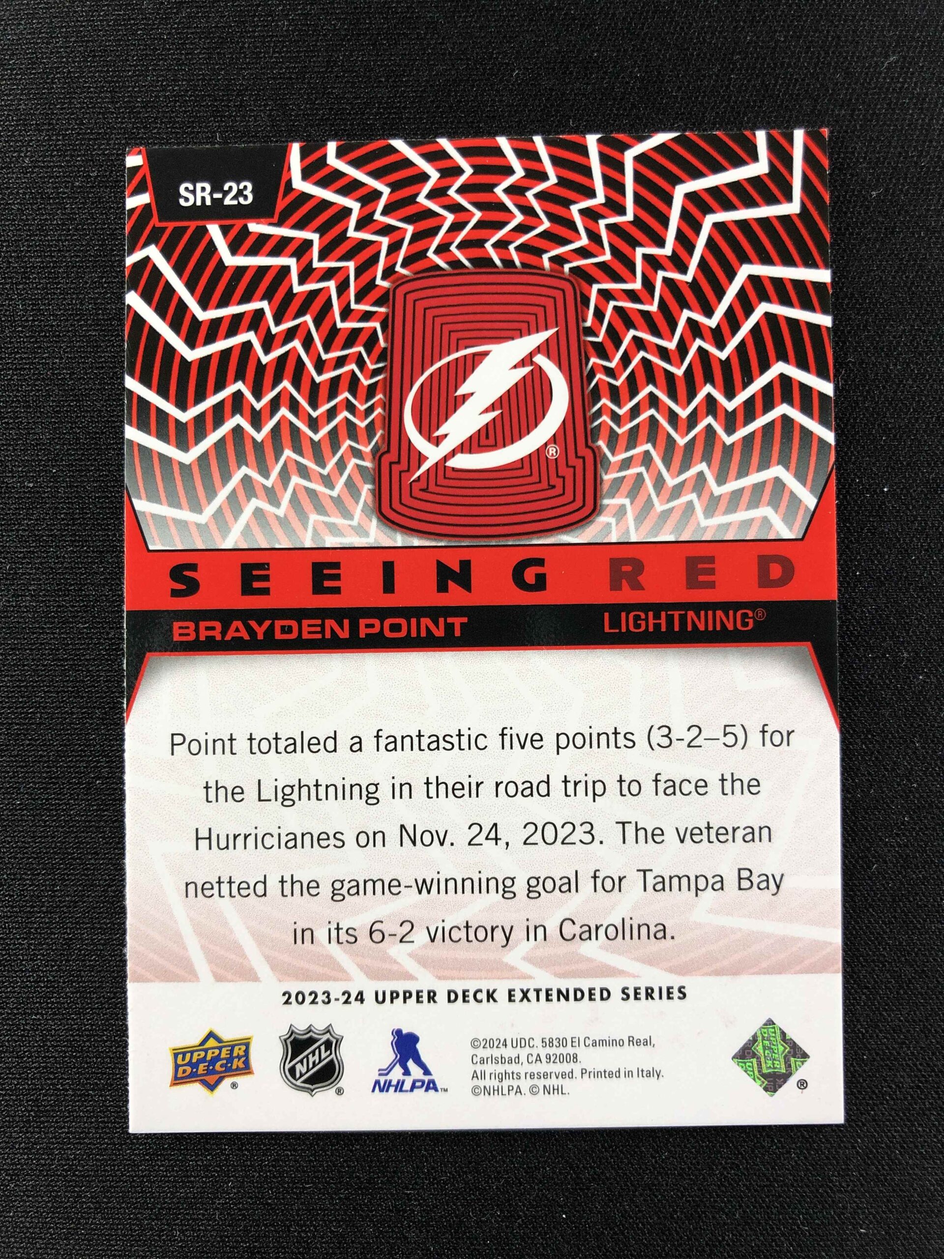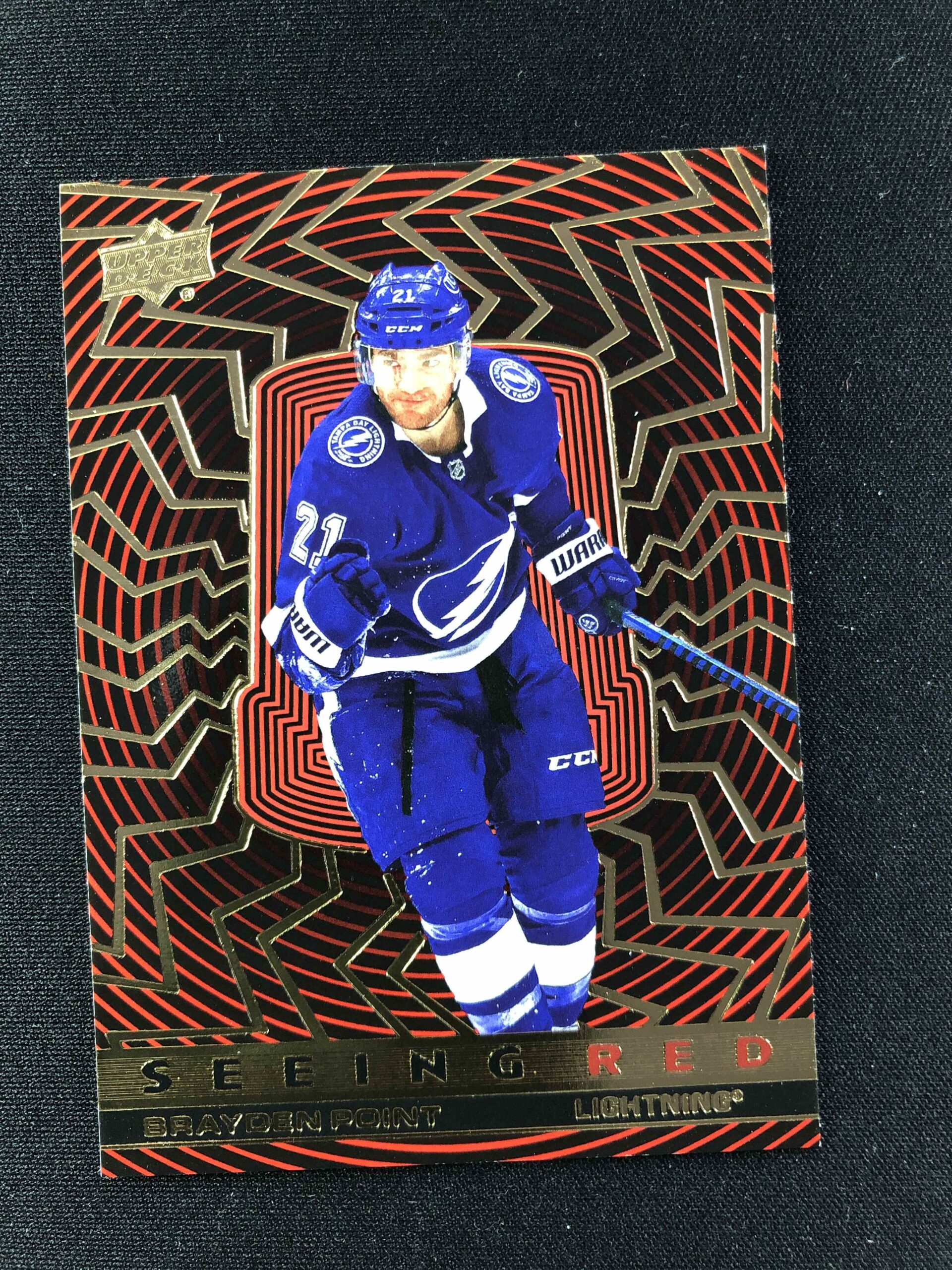 Sběratelská karta 2023/2024 Upper Deck Extended Seeing Red Gold Foil SR-23 Brayden Point Inzert