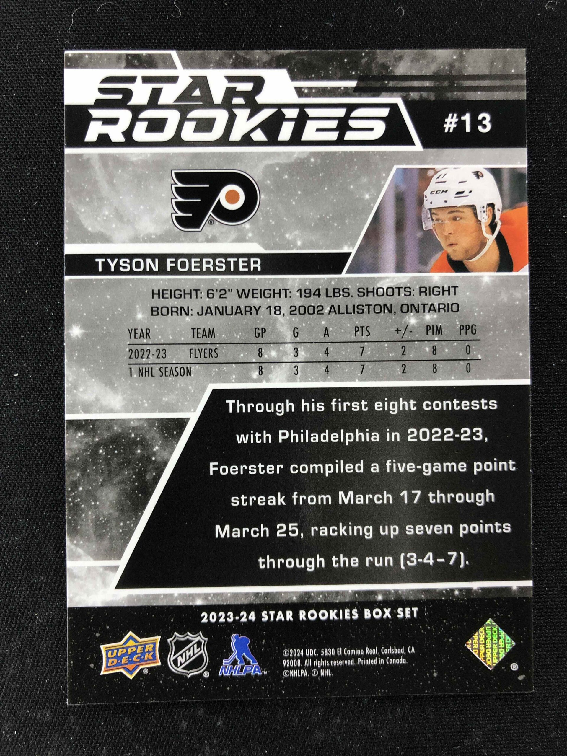 Sběratelská karta 2023/2024 Upper Deck NHL Star Rookies Box Set Base 13 Tyson Foerster