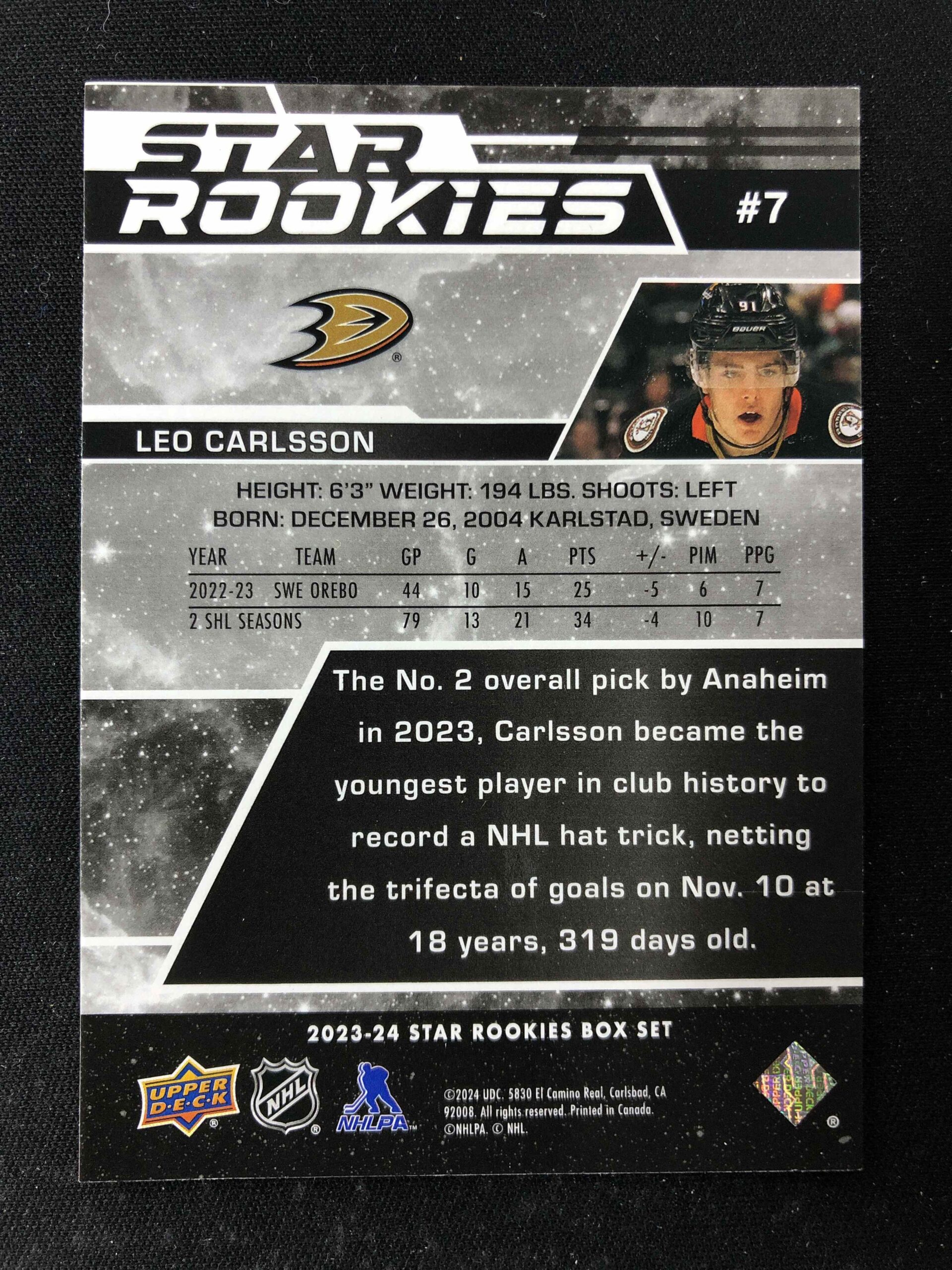 Sběratelská karta 2023/2024 Upper Deck NHL Star Rookies Box Set Base 7 Leo Carlsson