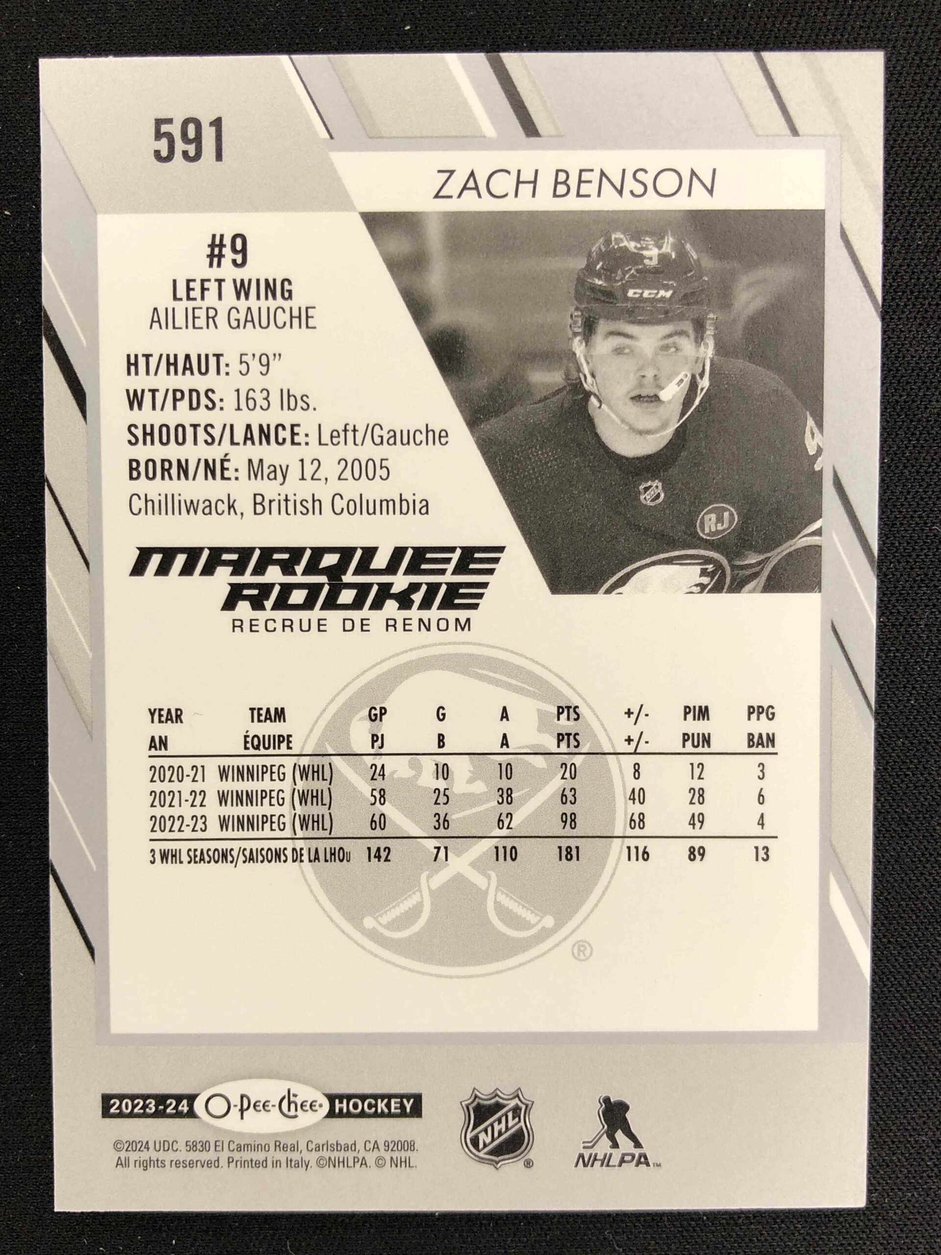 2023/2024 Upper Deck O-Pee-Chee Marquee Rookie 591 Zach Benson Inzert