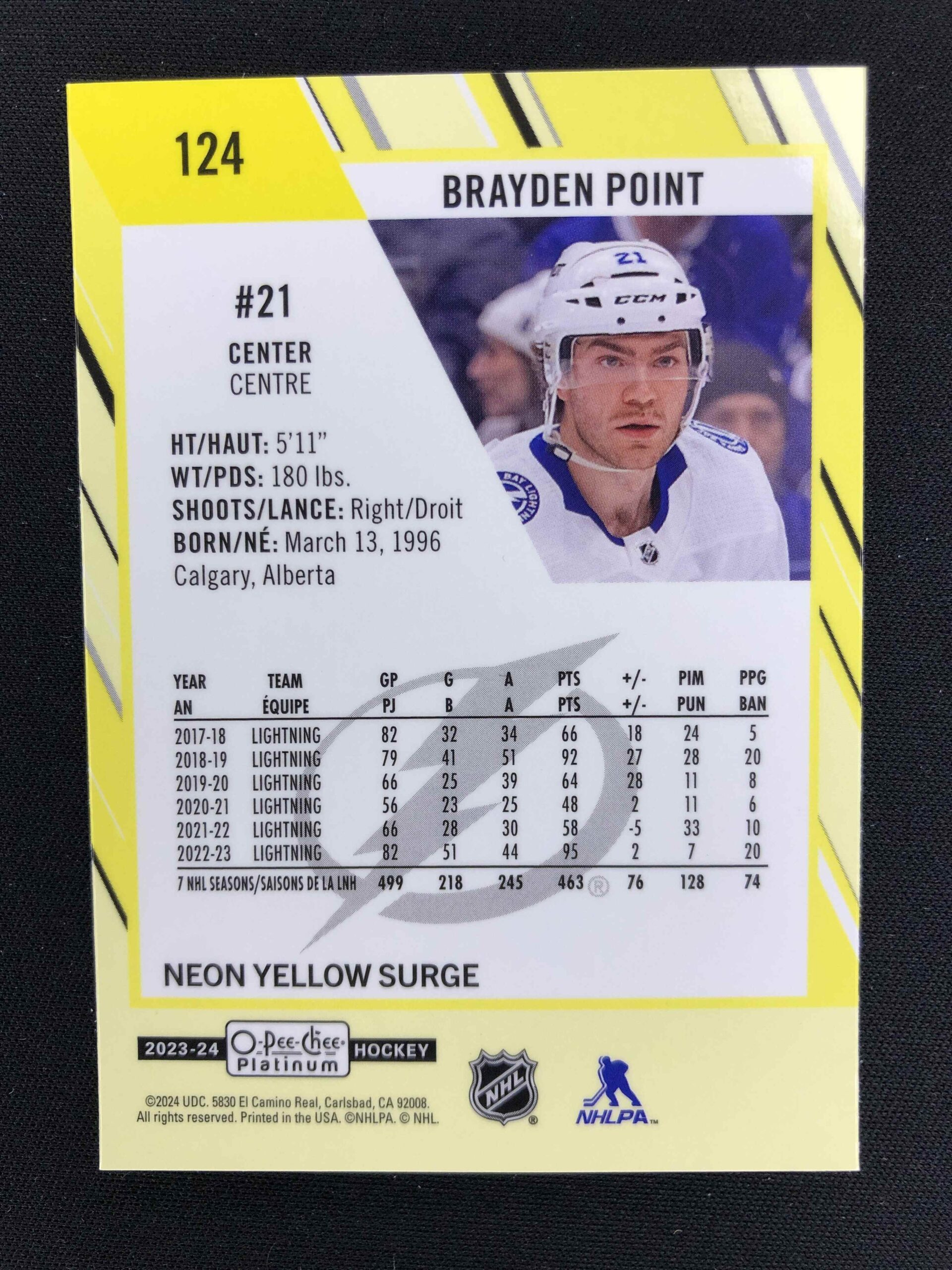 Sběratelská karta 2023/2024 Upper Deck OPC Platinum Neon Yellow Surge 124 Brayden Point Paralel