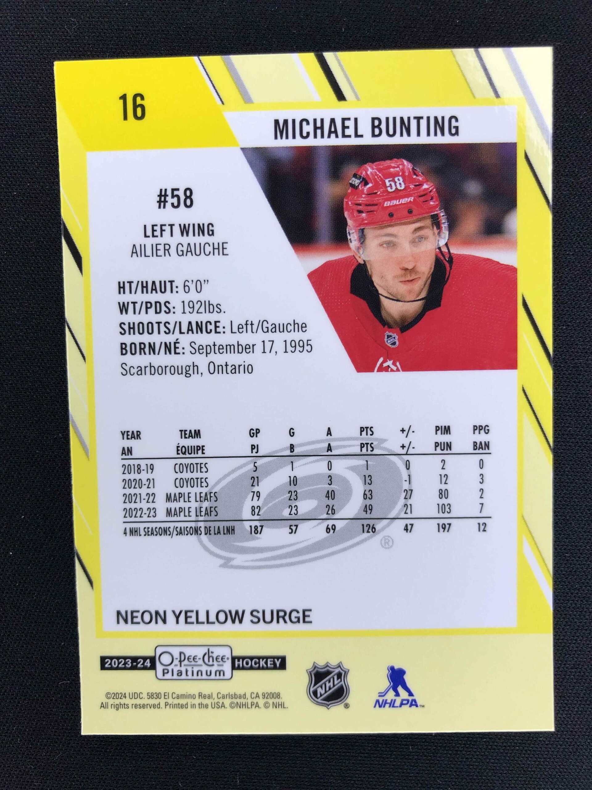 Sběratelská karta 2023/2024 Upper Deck OPC Platinum Neon Yellow Surge 16 Michael Bunting Paralel