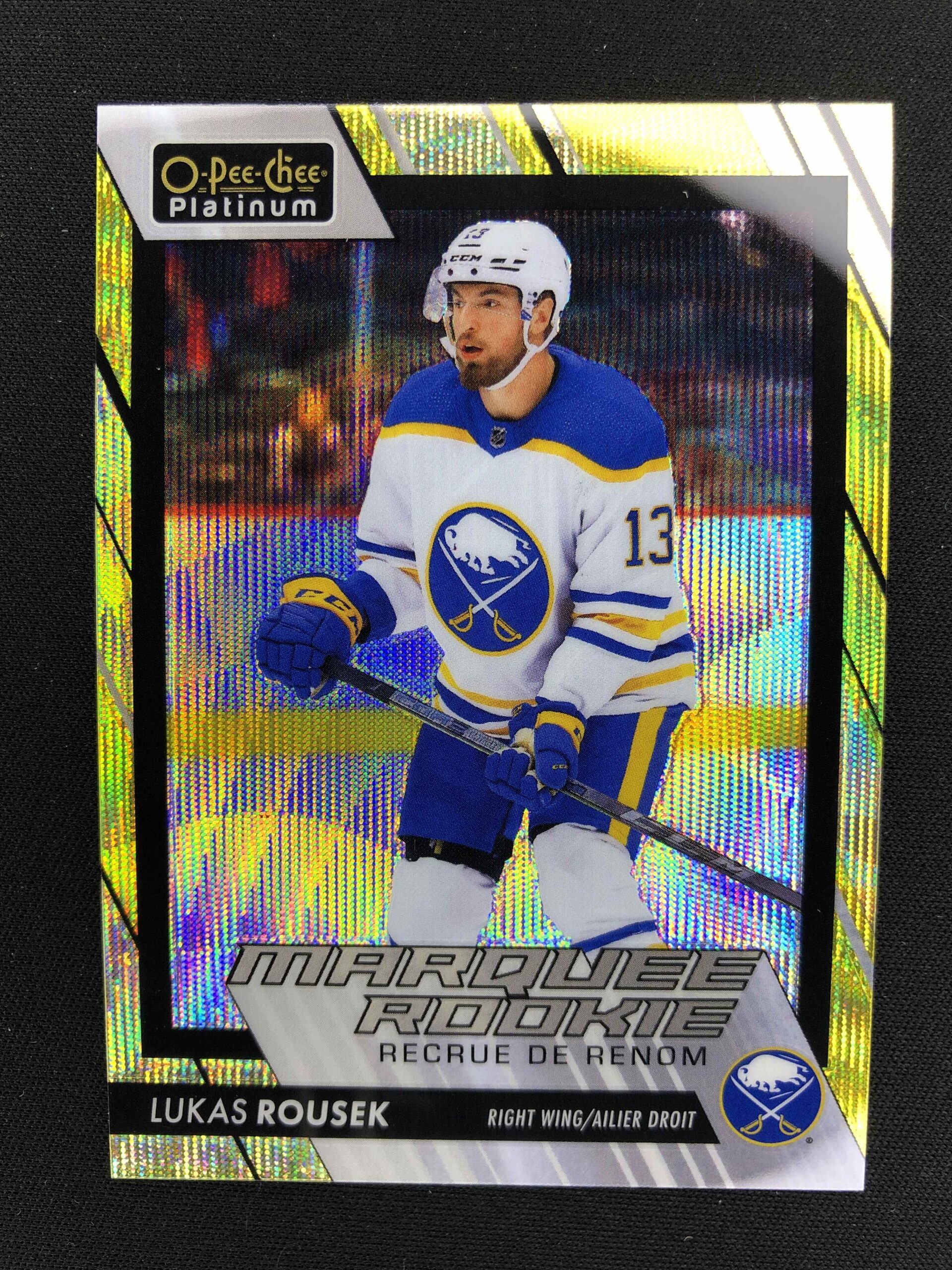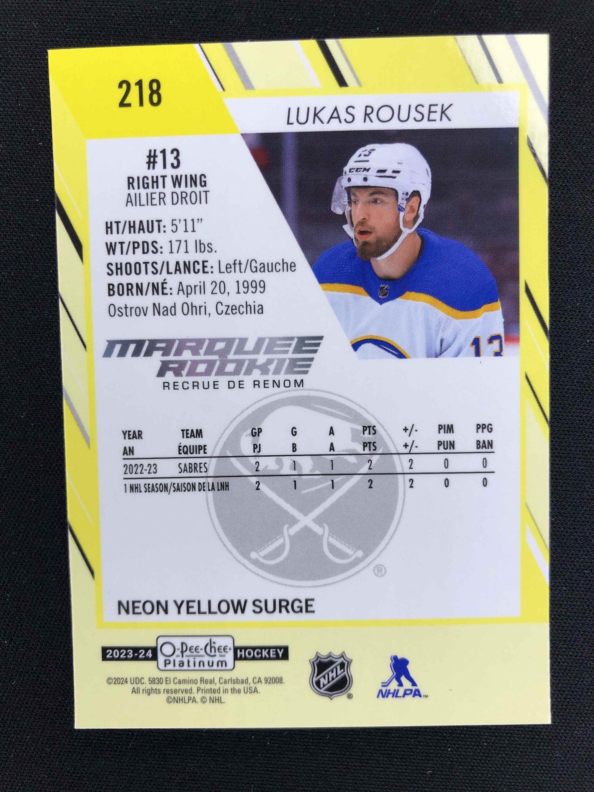 Sběratelská karta 2023/2024 Upper Deck OPC Platinum Neon Yellow Surge Marquee Rookie 218 Lukas Rousek Paralel