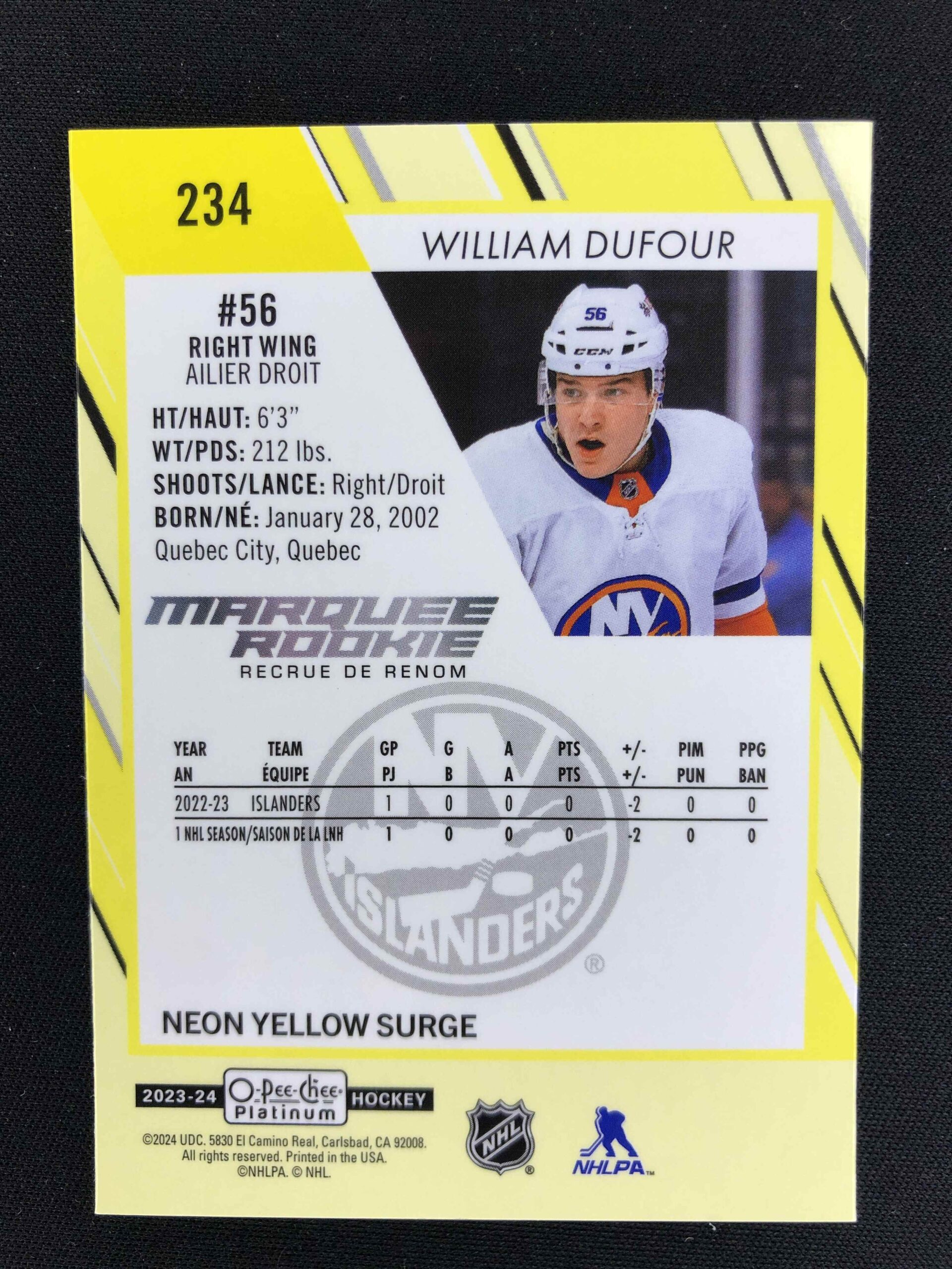 Sběratelská karta 2023/2024 Upper Deck OPC Platinum Neon Yellow Surge Marquee Rookie 234 William Dufour Paralel