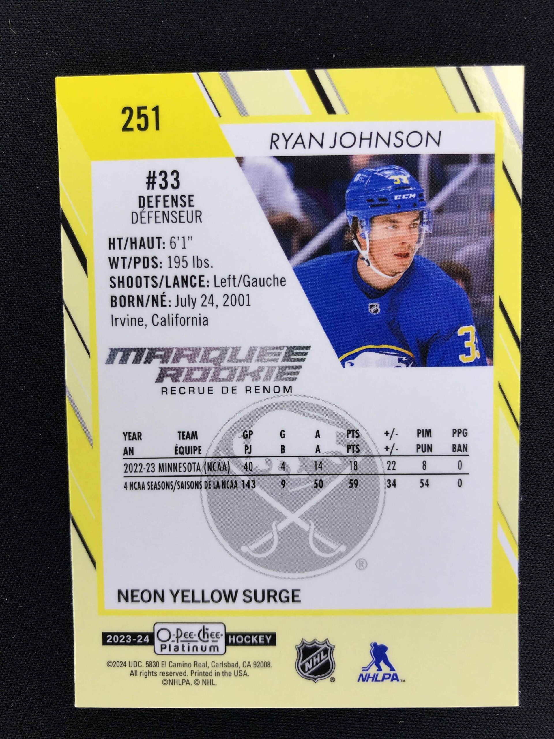 Sběratelská karta 2023/2024 Upper Deck OPC Platinum Neon Yellow Surge Marquee Rookie 251 Ryan Johnson Paralel