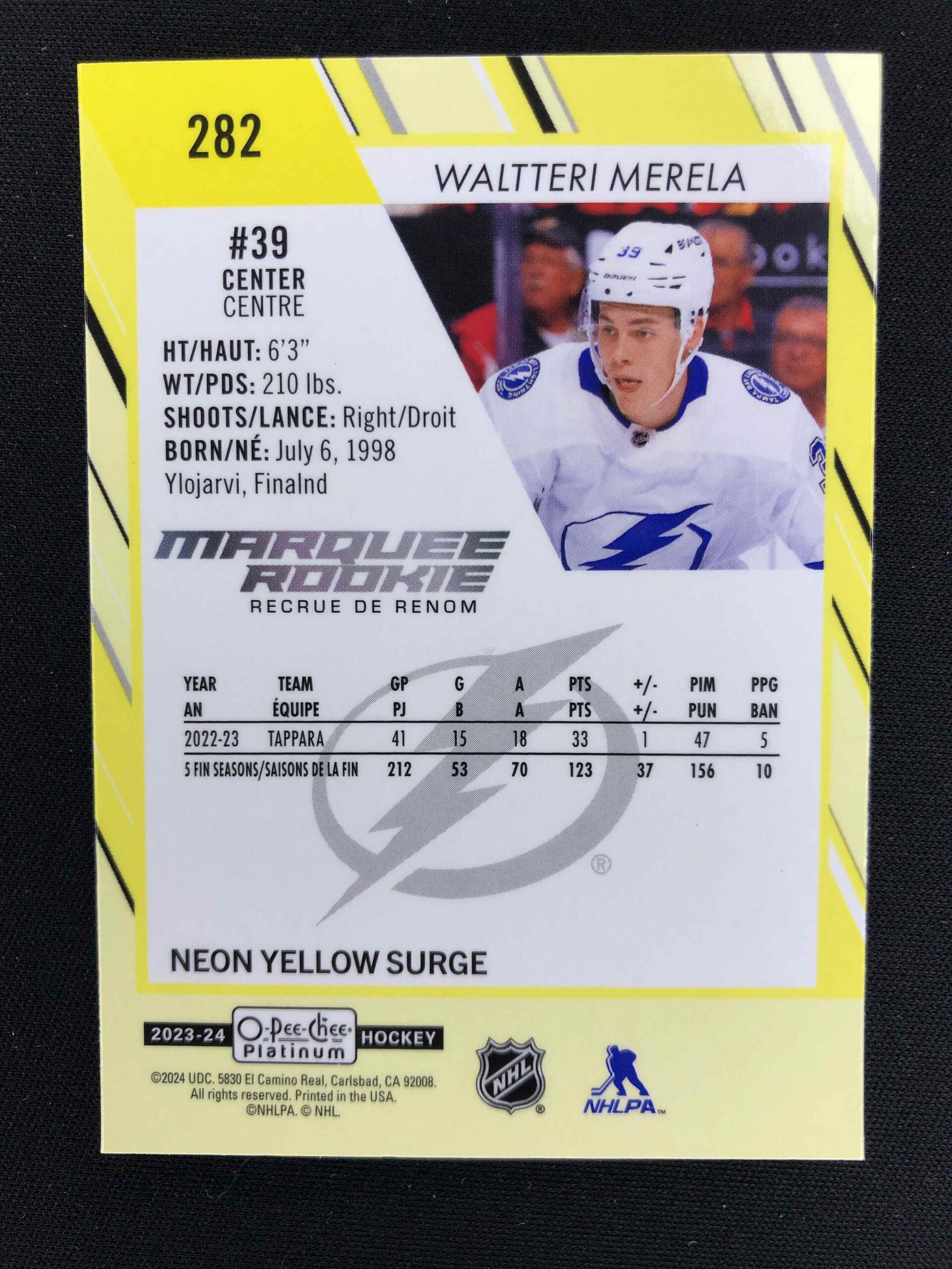 Sběratelská karta 2023/2024 Upper Deck OPC Platinum Neon Yellow Surge Marquee Rookie 282 Waltteri Merela Paralel
