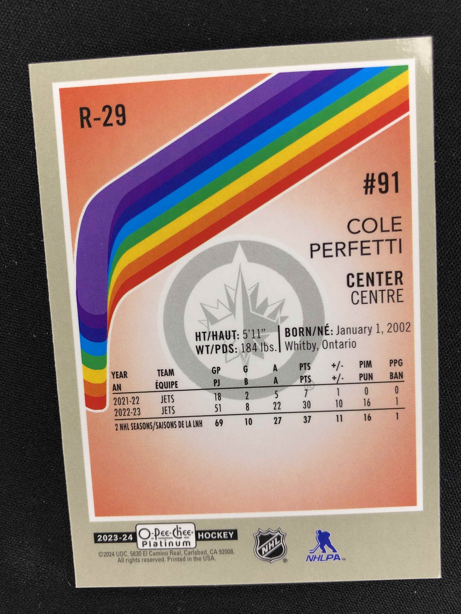 Sběratelská karta 2023/2024 Upper Deck OPC Platinum Retro R-29 Cole Perfetti Paralel