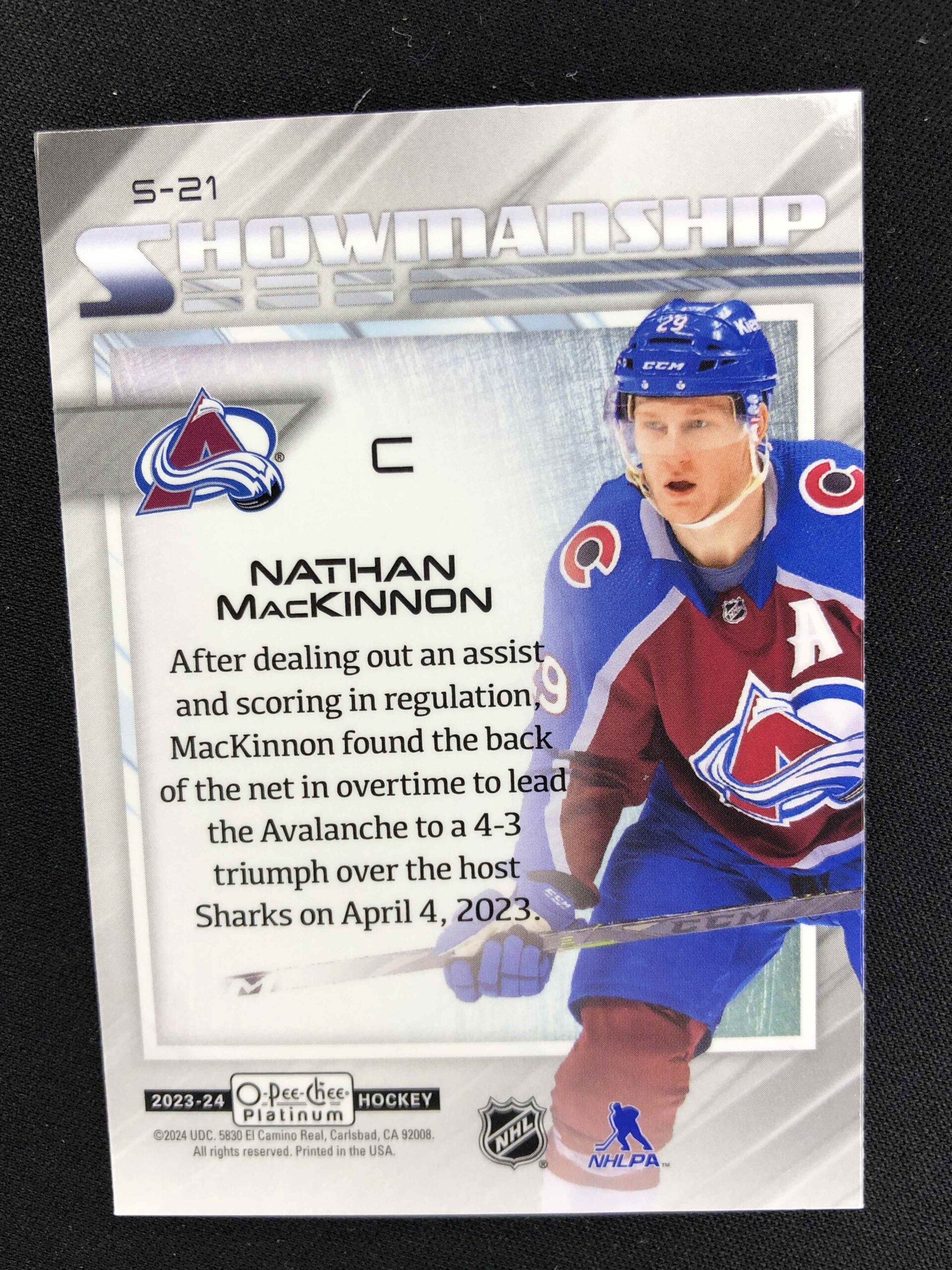 Sběratelská karta 2023/2024 Upper Deck OPC Platinum Showmanship S-21 Nathan MacKinnon Inzert