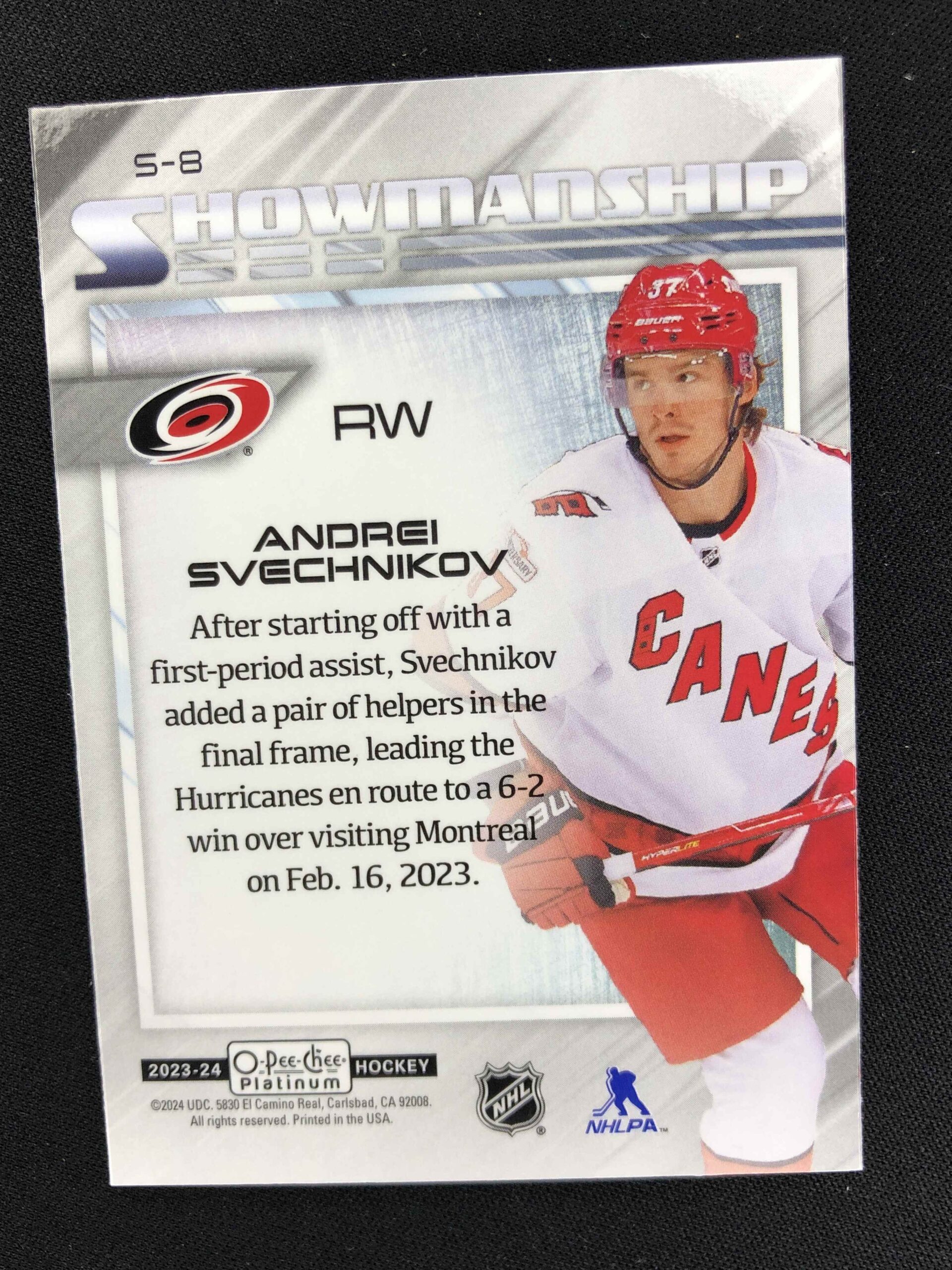 Sběratelská karta 2023/2024 Upper Deck OPC Platinum Showmanship S-8 Andrei Svechnikov Inzert