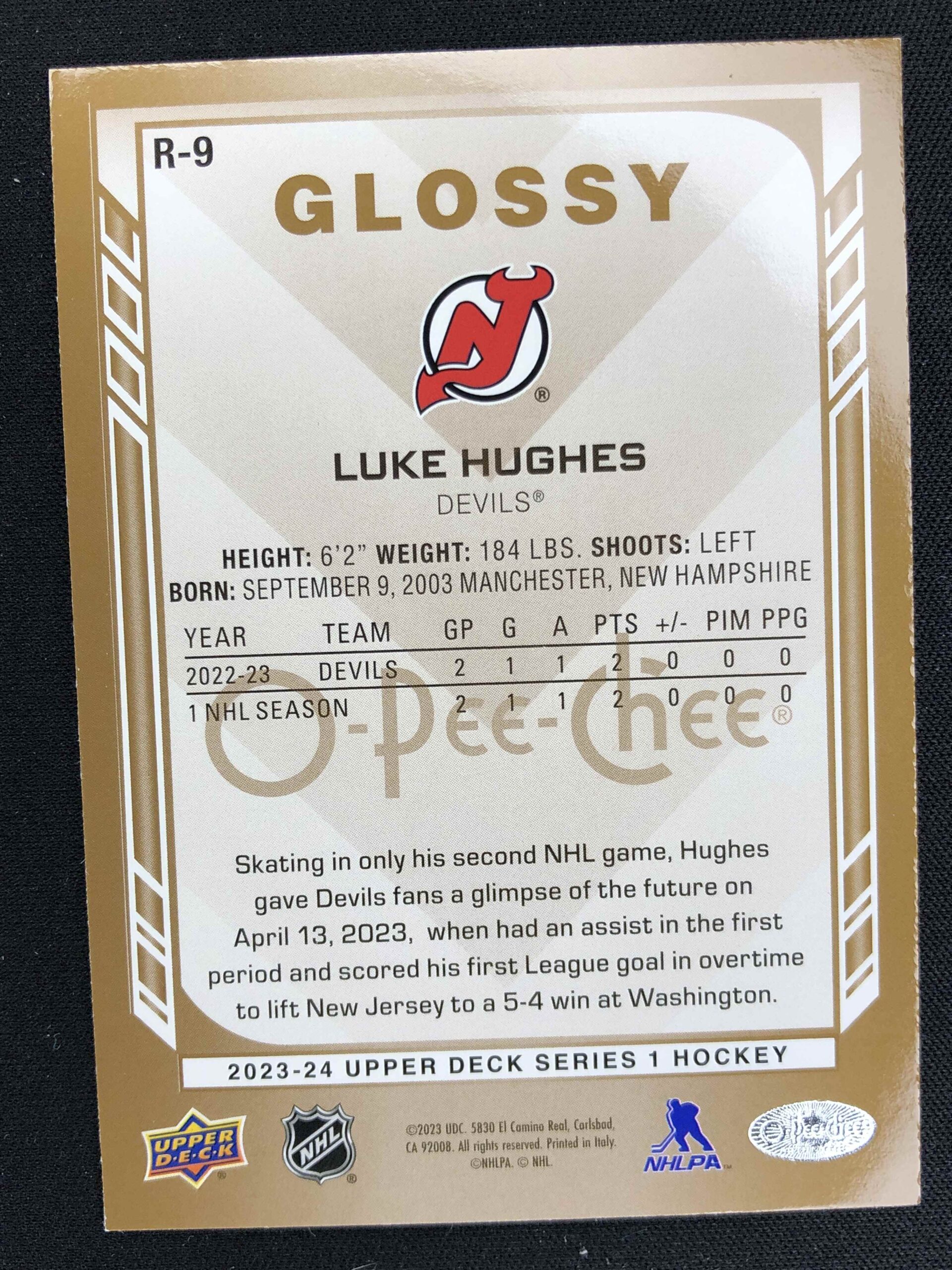 Sběratelská karta 2023/2024 Upper Deck Series 1 Glossy R-9 Luke Hughes Inzert