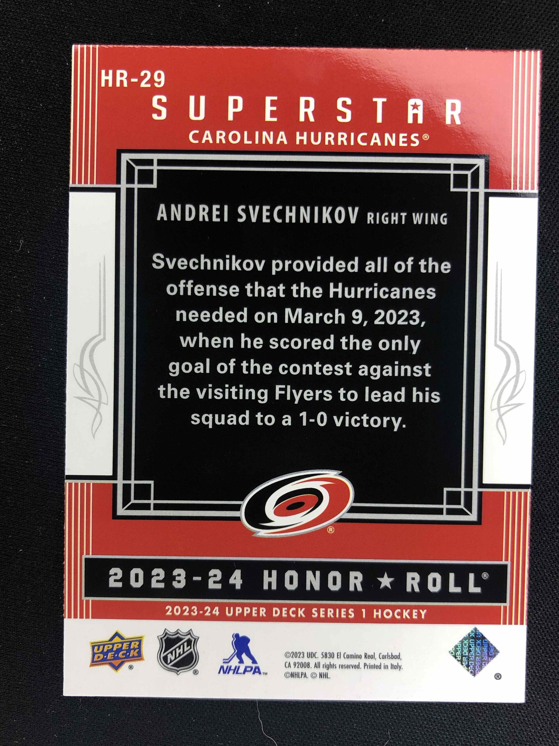 Sběratelská karta 2023/2024 Upper Deck Series 1 Honor Roll HR-29 Andrei Svechnikov Inzert