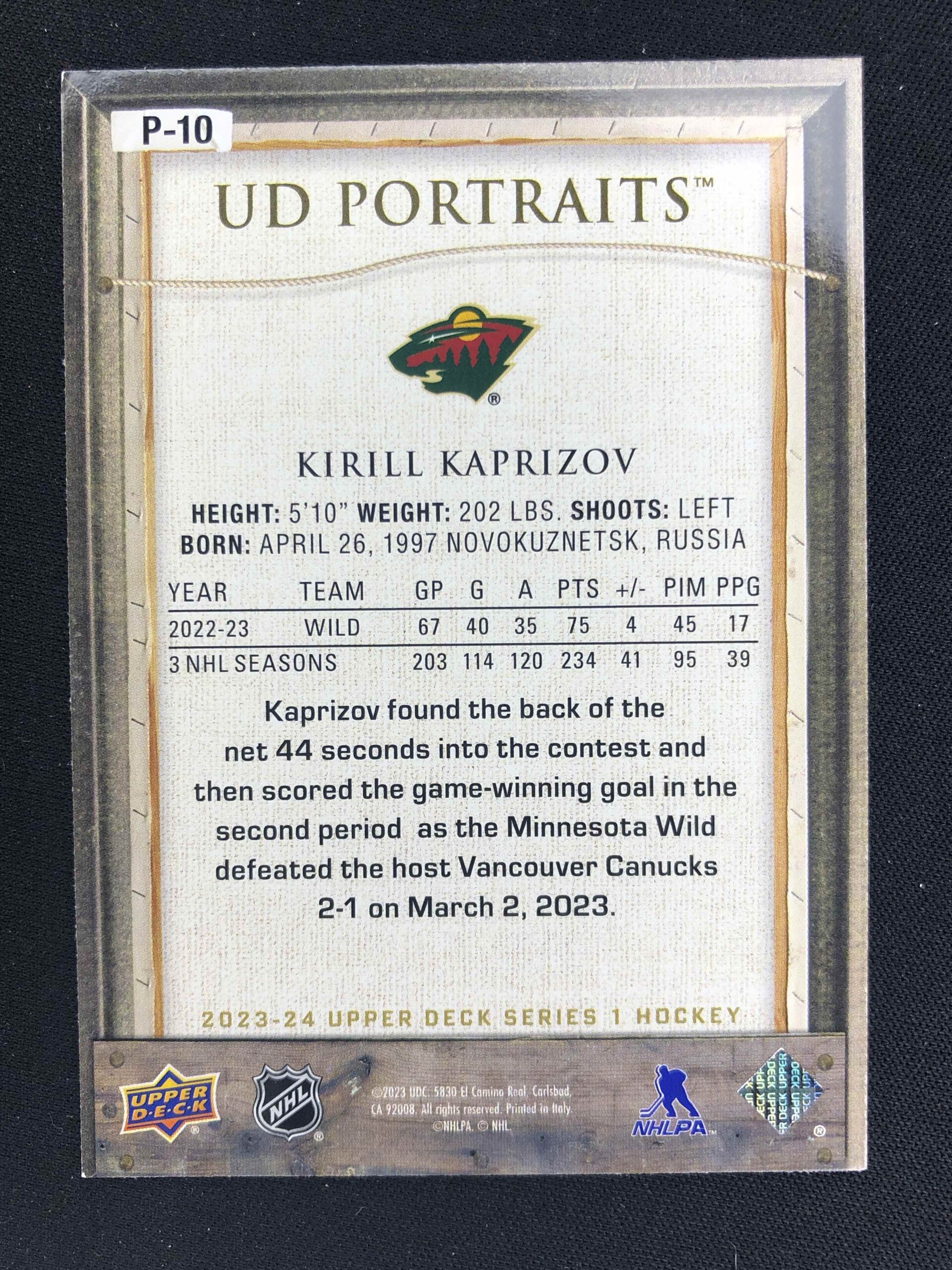 Sběratelská karta 2023/2024 Upper Deck Series 1 Portraits P-10 Kirill Kaprizov Inzert