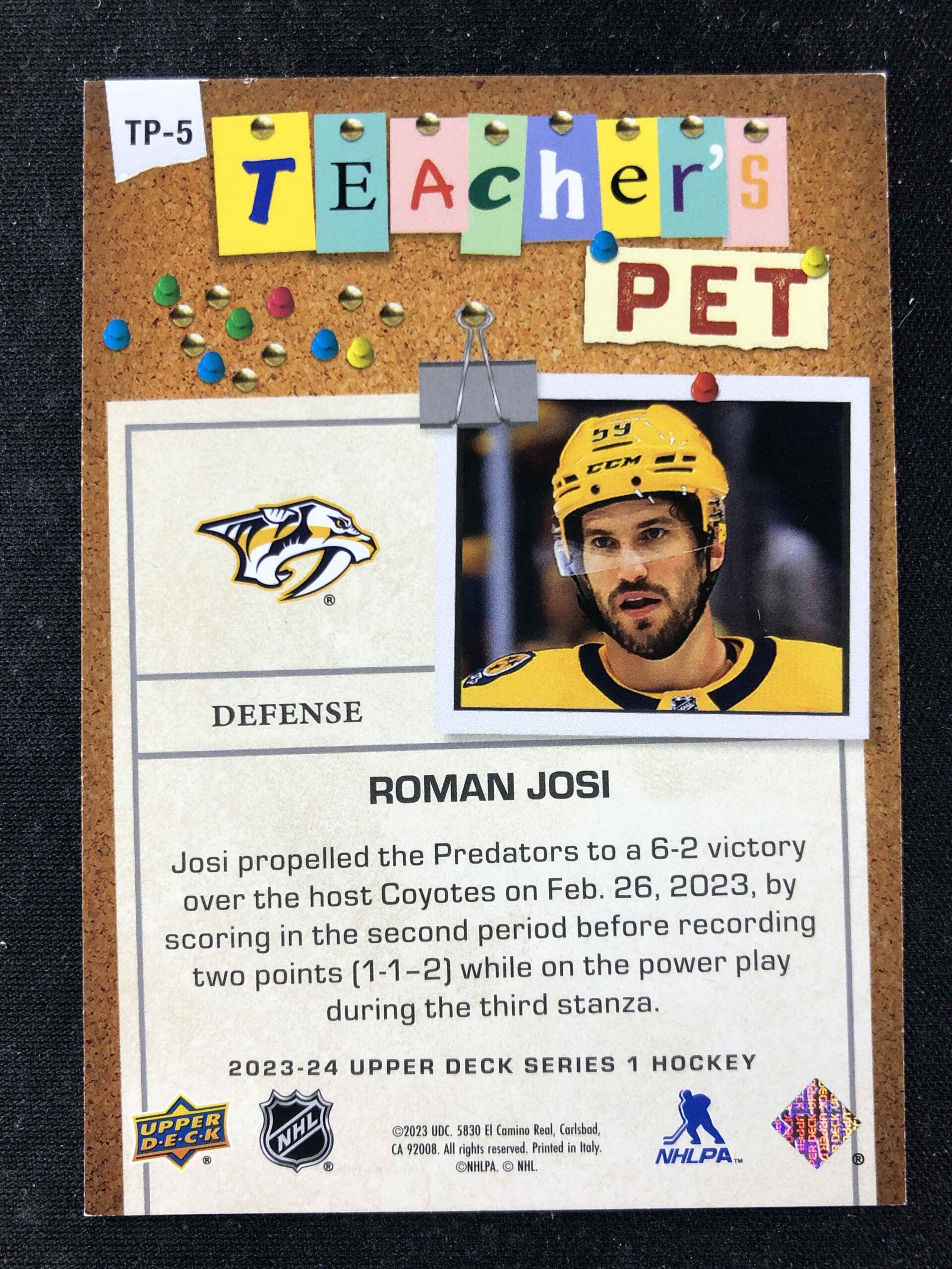 Sběratelská karta 2023/2024 Upper Deck Series 1 Teachers Pet TP-5 Roman Josi Inzert