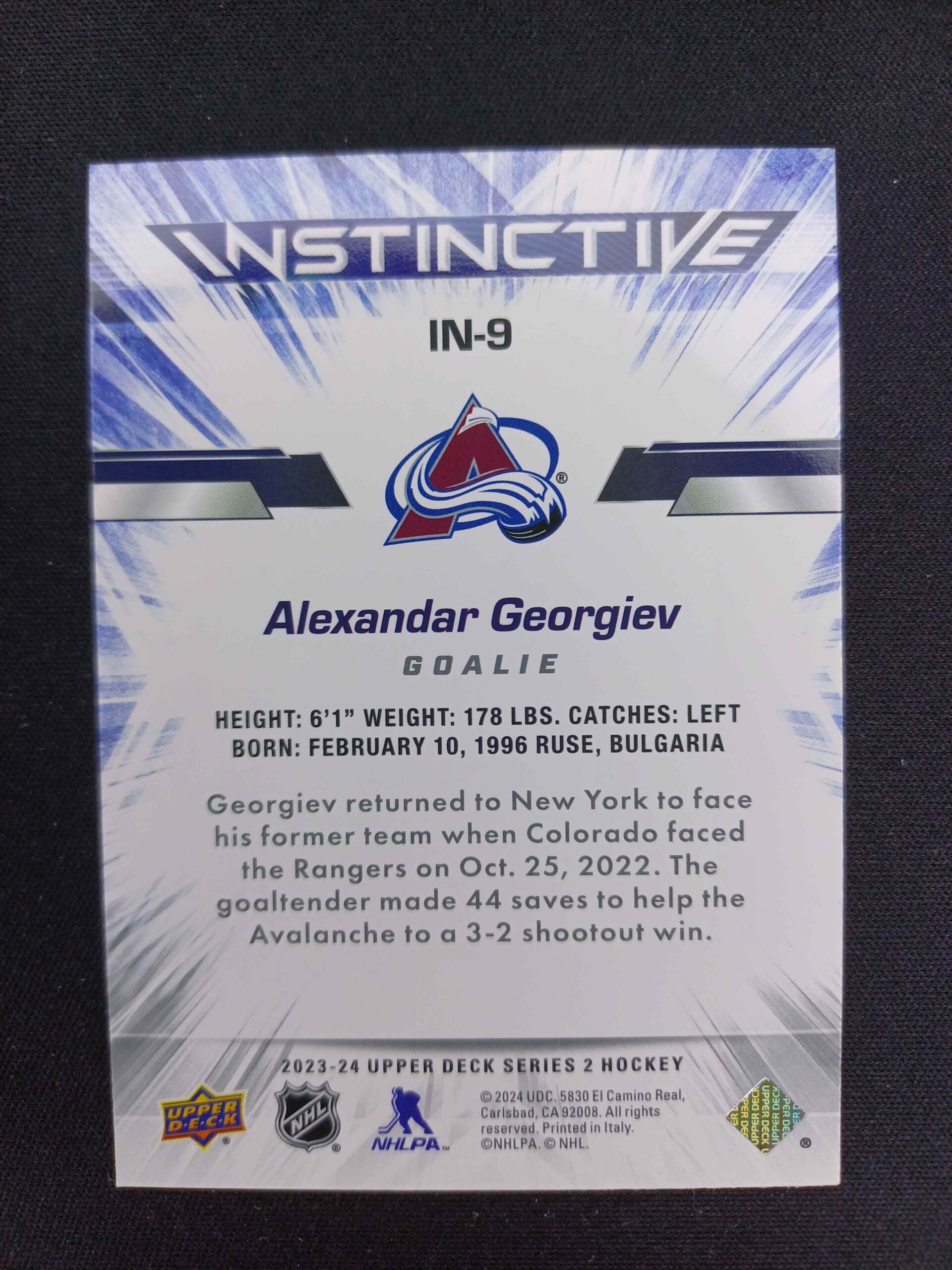 Sběratelská karta 2023/2024 Upper Deck Series 2 Instinctive 9 Alexandar Georgiev Inzert