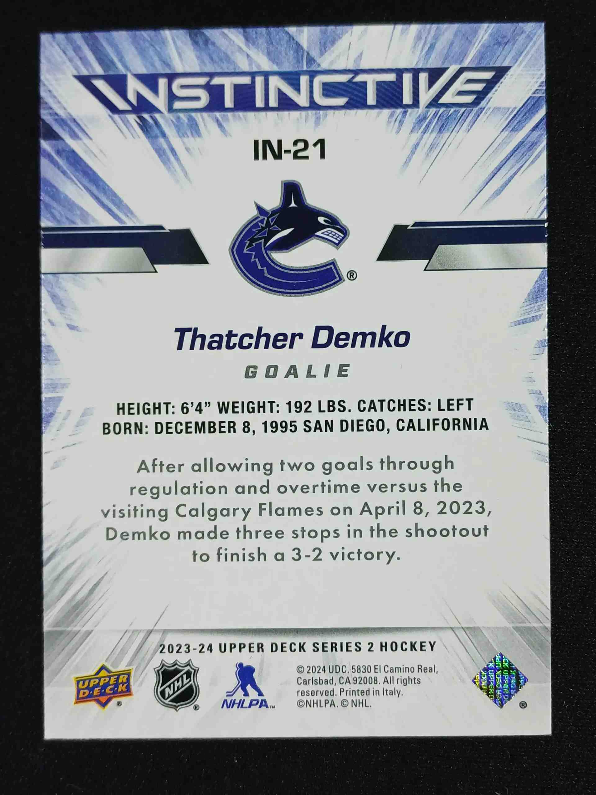 Sběratelská karta 2023/2024 Upper Deck Series 2 Instinctive IN-21 Thatcher Demko Inzert