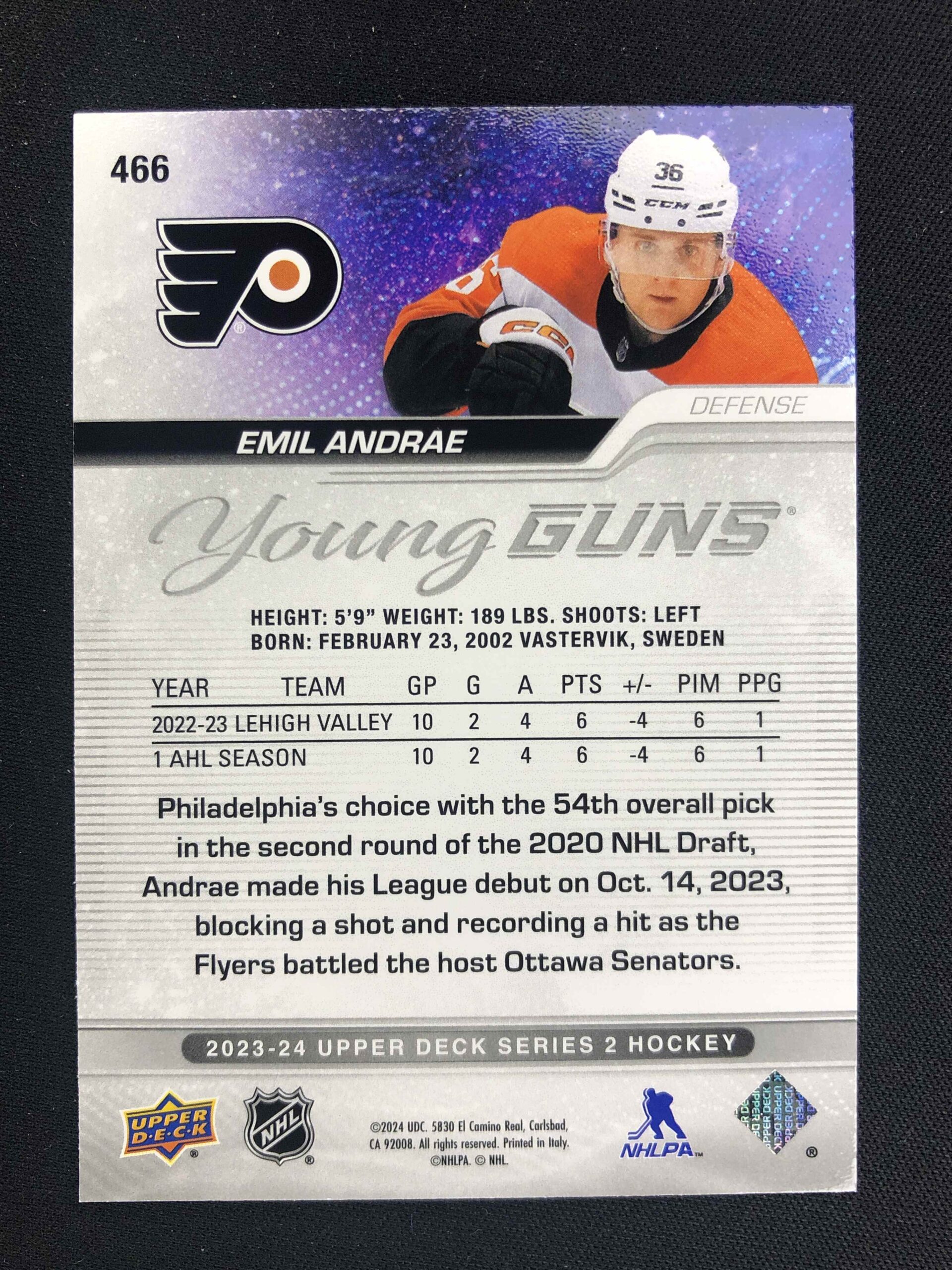 Sběratelská karta 2023/2024 Upper Deck Series 2 Young Guns 466 Emil Andrae Inzert