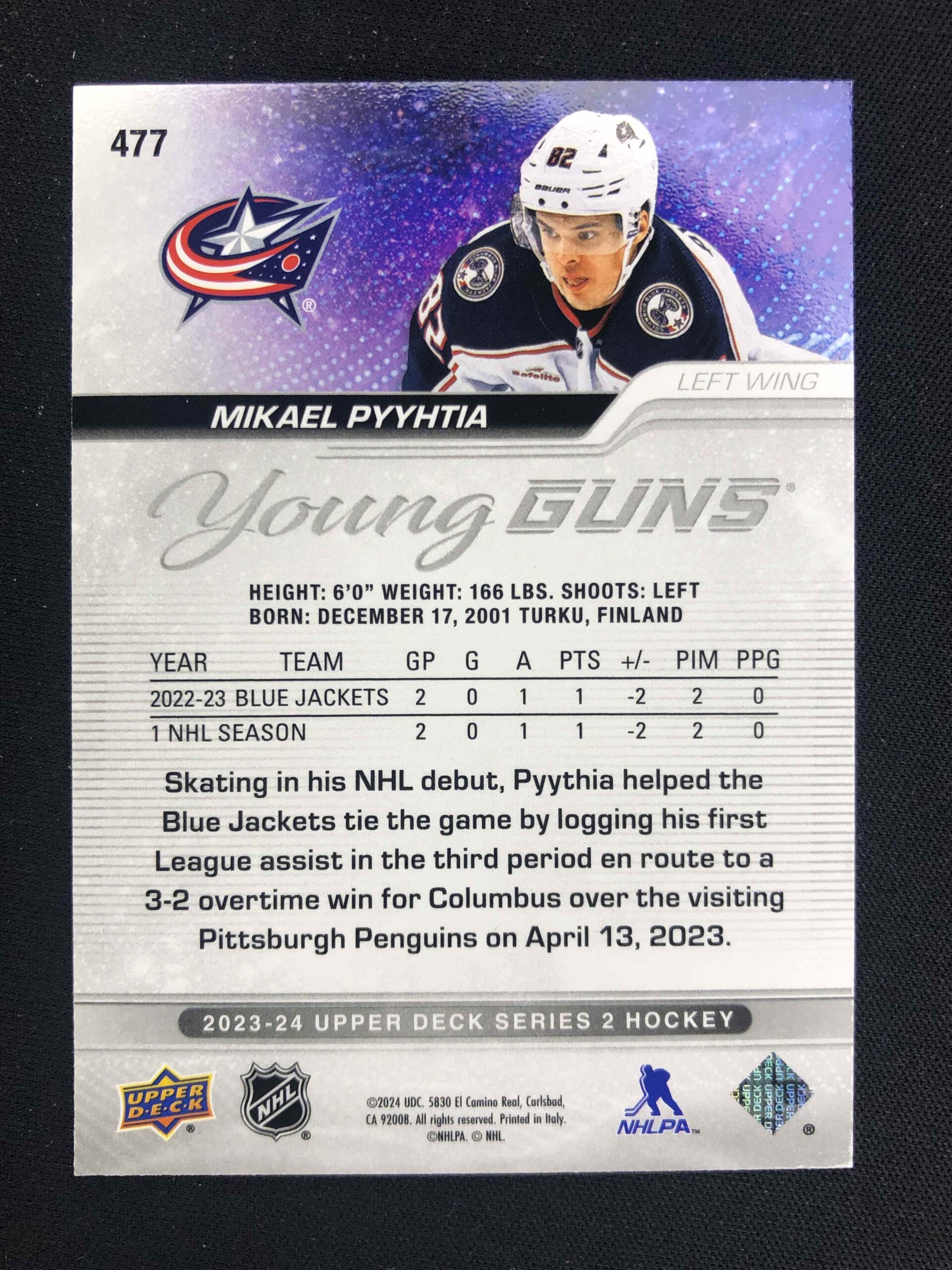Sběratelská karta 2023/2024 Upper Deck Series 2 Young Guns 477 Mikael Pyyhtia Inzert