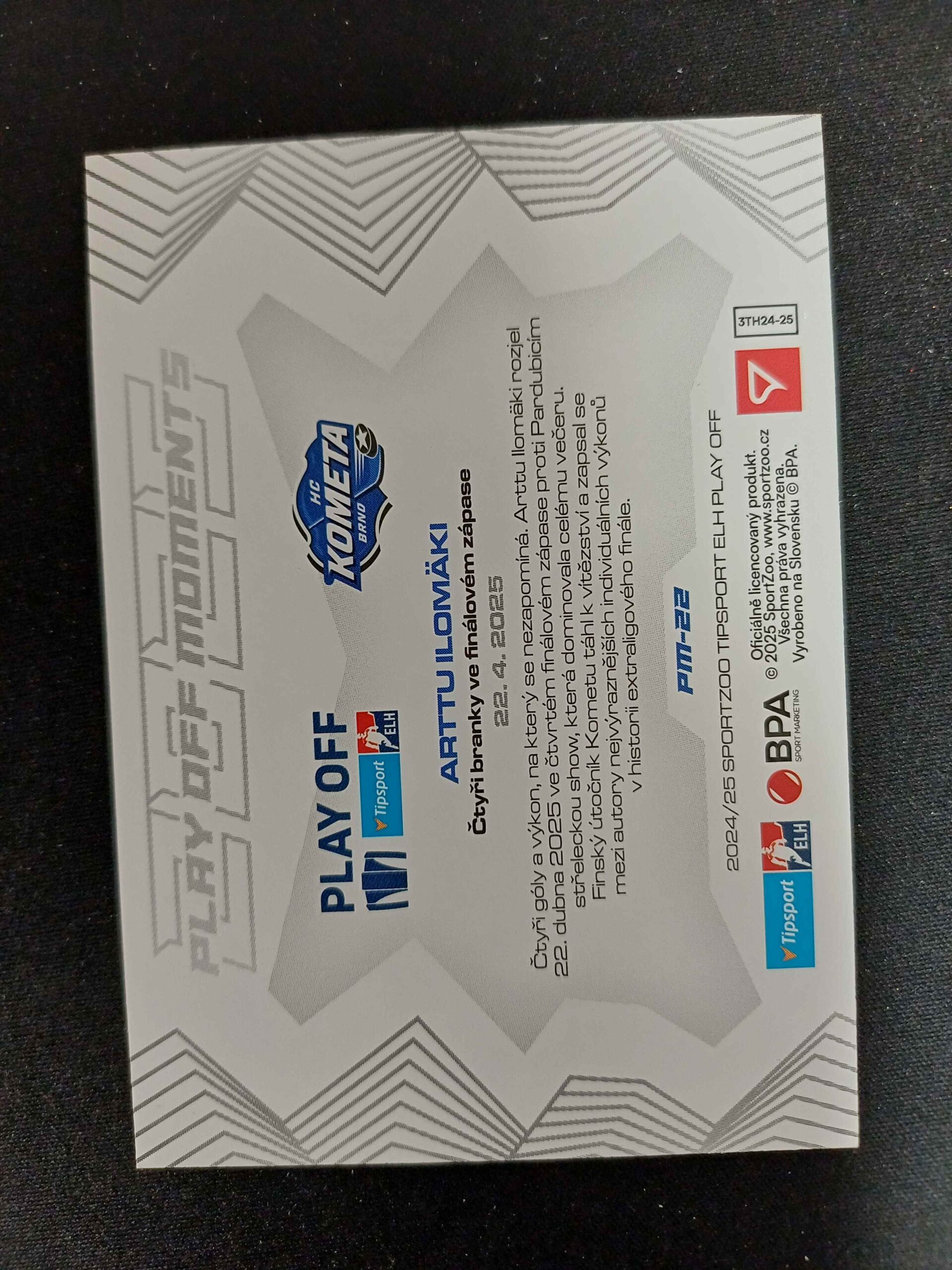 Sběratelská karta 2024/2025 Sportzoo Play Off Play Off Moments PM-22 Arttu Ilomäki Inzert